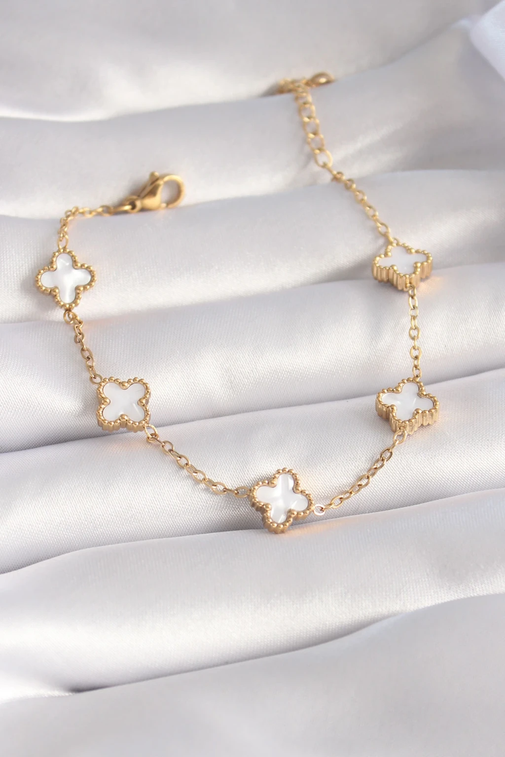 Beyaz Sedefli Yonca Model Gold Renk Kadın Bileklik - TJ-BB8005