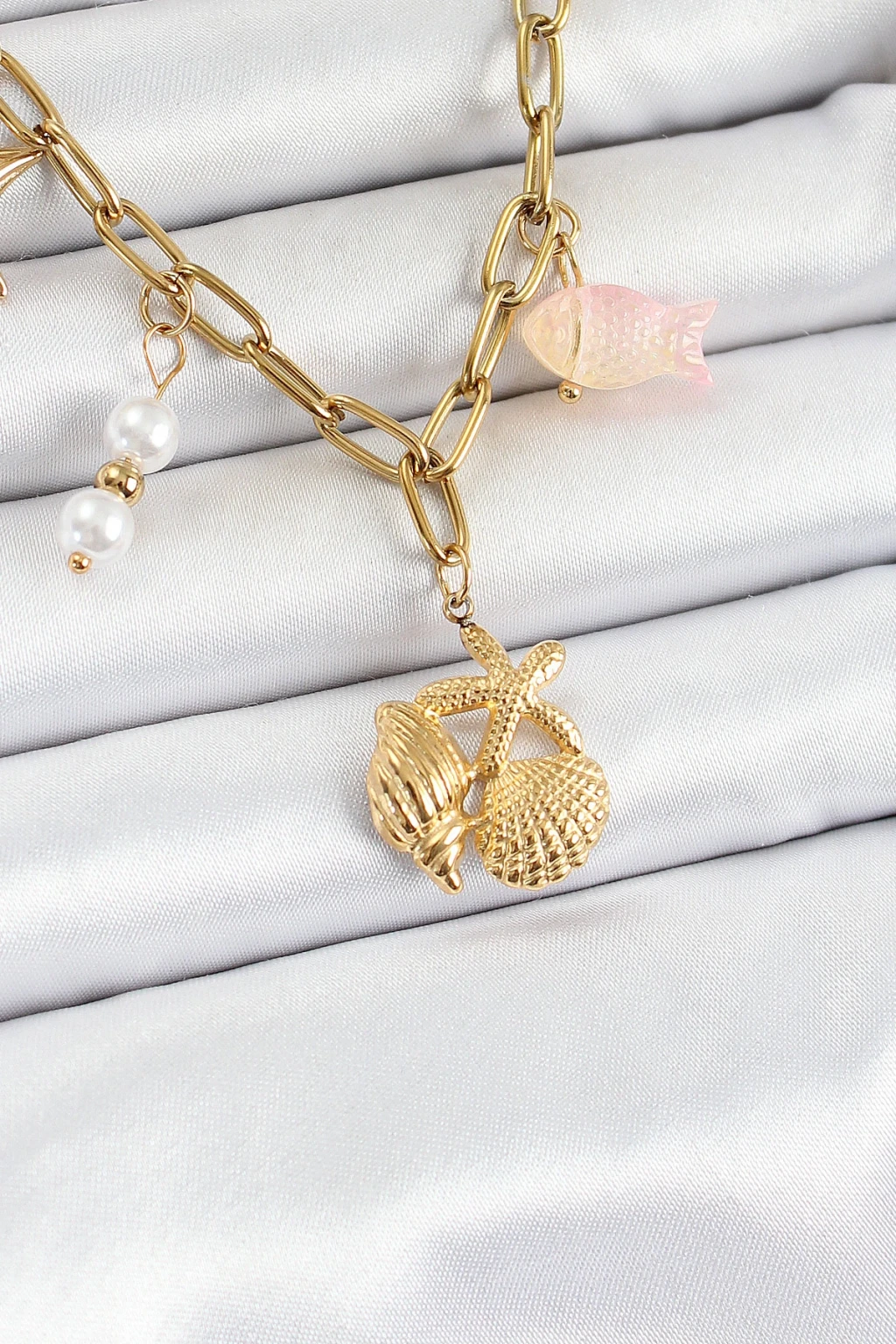316L Çelik Gold Renk Deniz Yıldızı ve Deniz Kabuğu Konsept Kadın Kolye - TJ-BKO10294