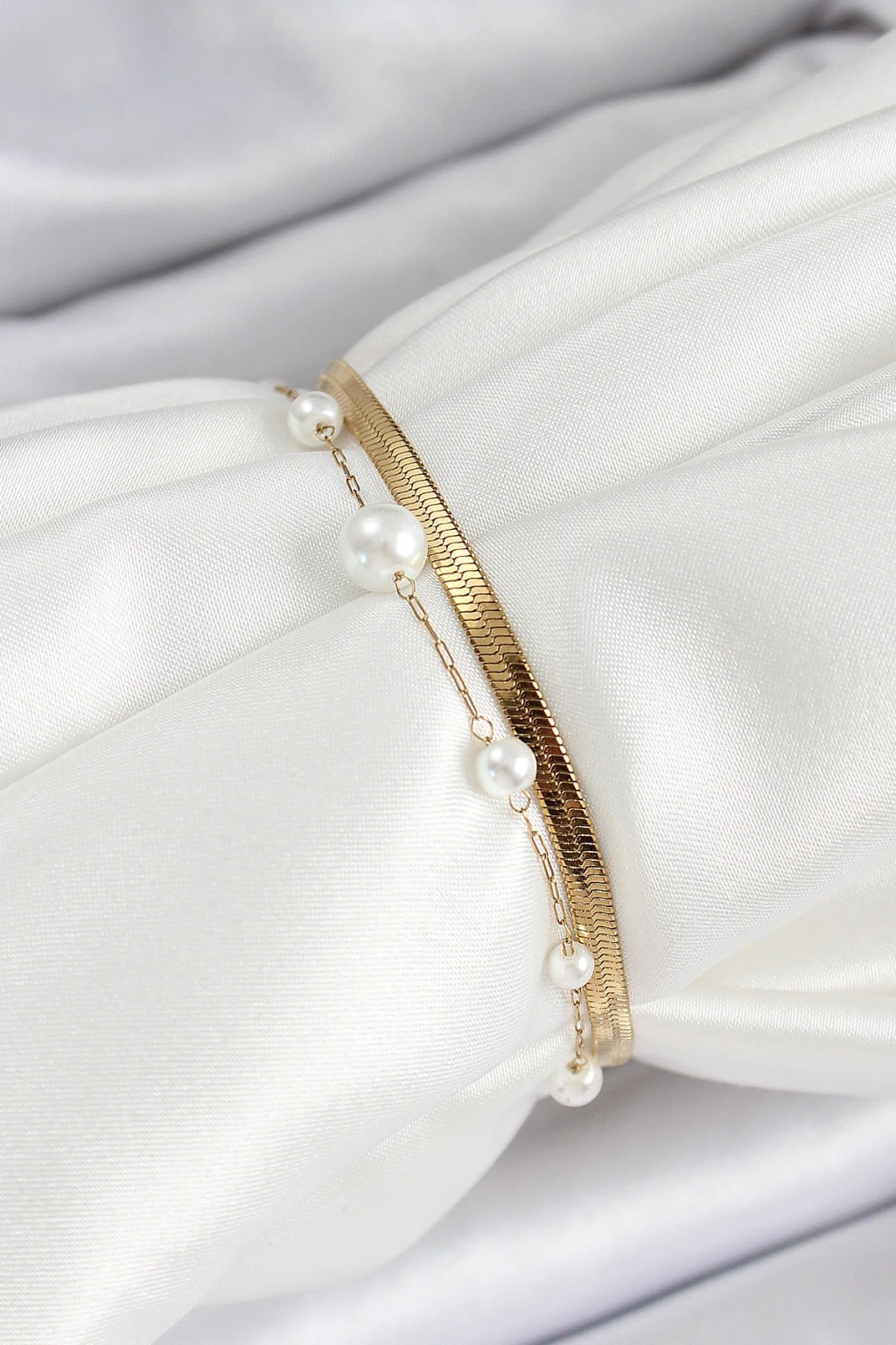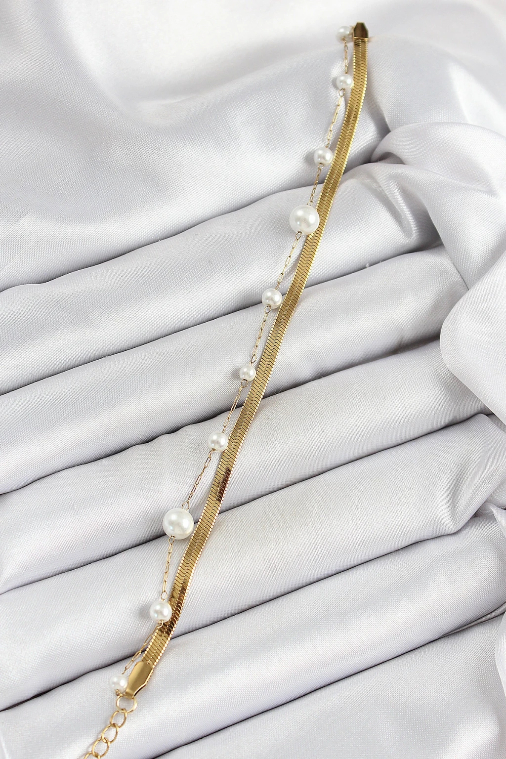 316L Çelik Gold Renk İncili ve İtalyan Zincirli Kadın Bileklik - TJ-BB7094
