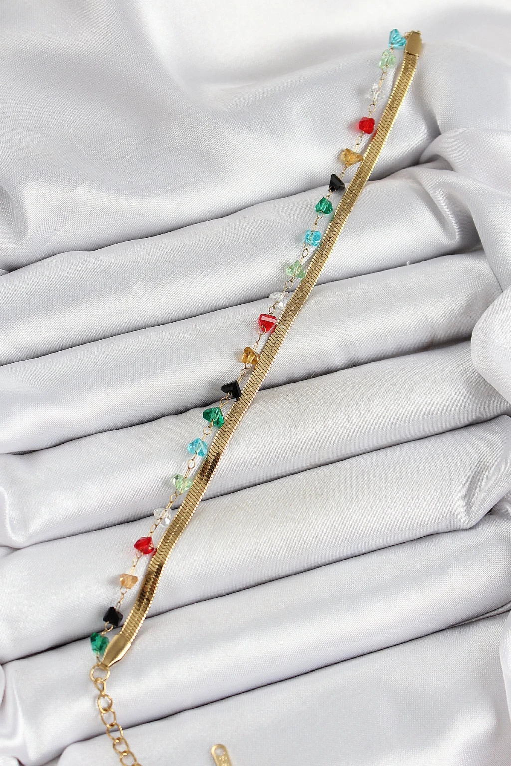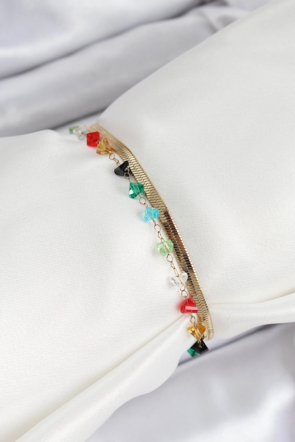 316L Çelik Gold Renk Kristal Karışık Renkli Taşlı 2'li Kadın Bileklik - TJ-BB7092