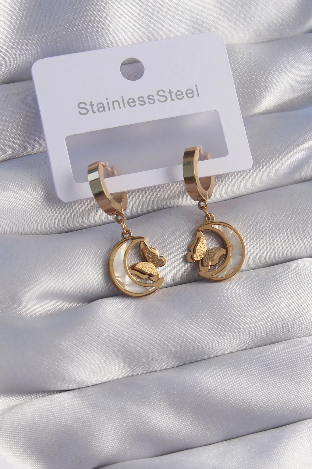 316L Çelik Gold Renk Mineli Ay Figürlü Kelebek Küpe - TJ-BKP9067
