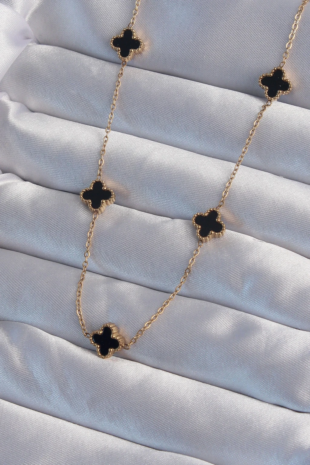 316L Çelik Gold Renk Minimal Siyah Mineli Yonca Kolye - TJ-BKO9004