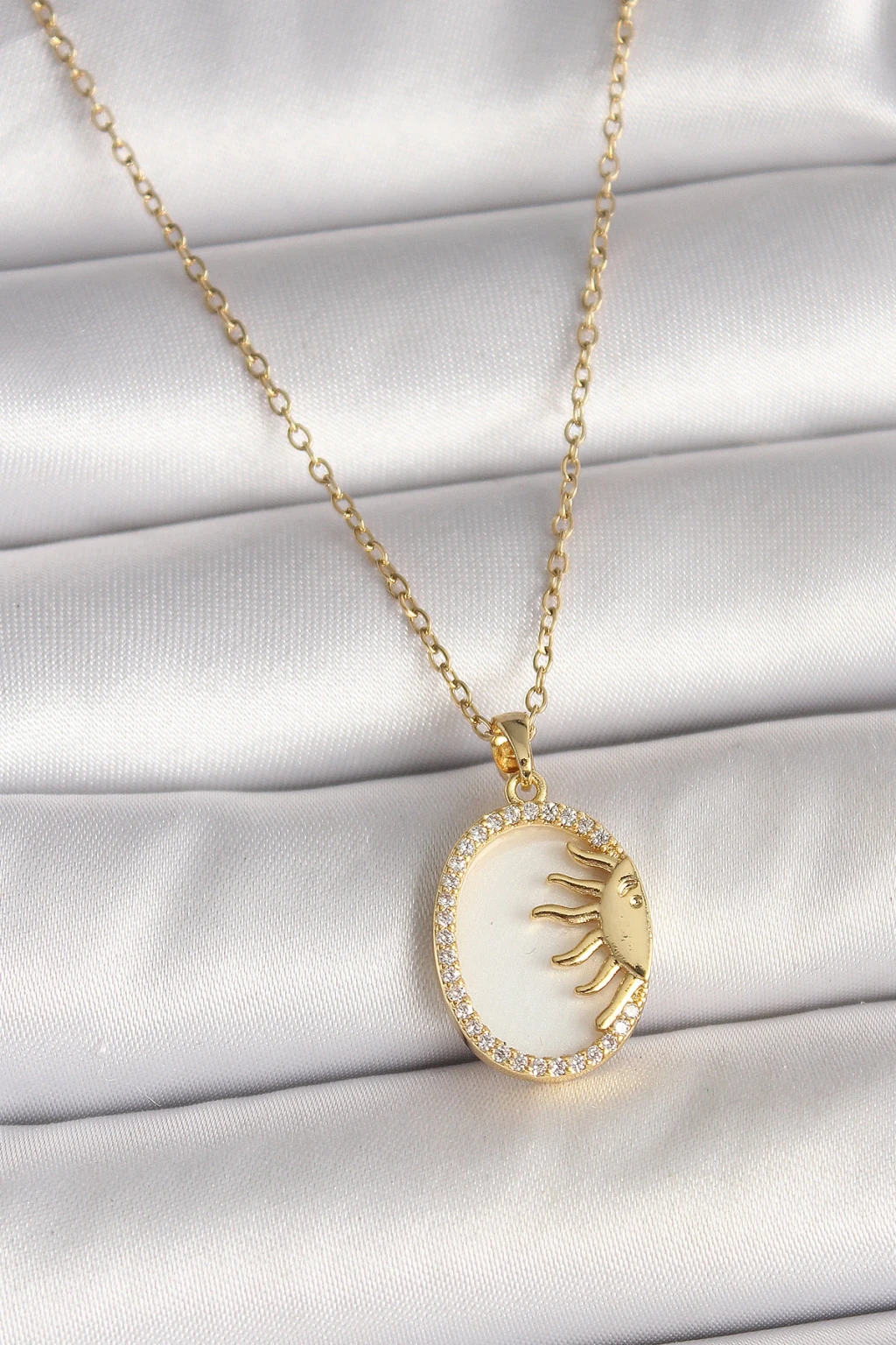 316L Çelik Gold Renk Zincir Beyaz Mineli Gün Batımı Model Zirkon Taş Detay Kadın Kolye - TJ-BKO10002