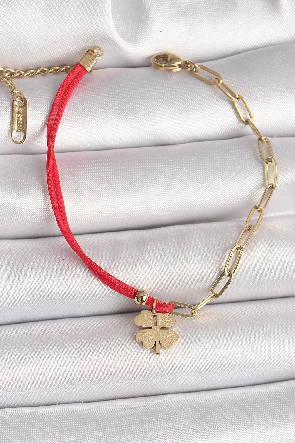 316L Çelik Gold Renk Zincir Kırmızı İp Model Sallantı Yonca Figür Kadın Bileklik - TJ-BB6867