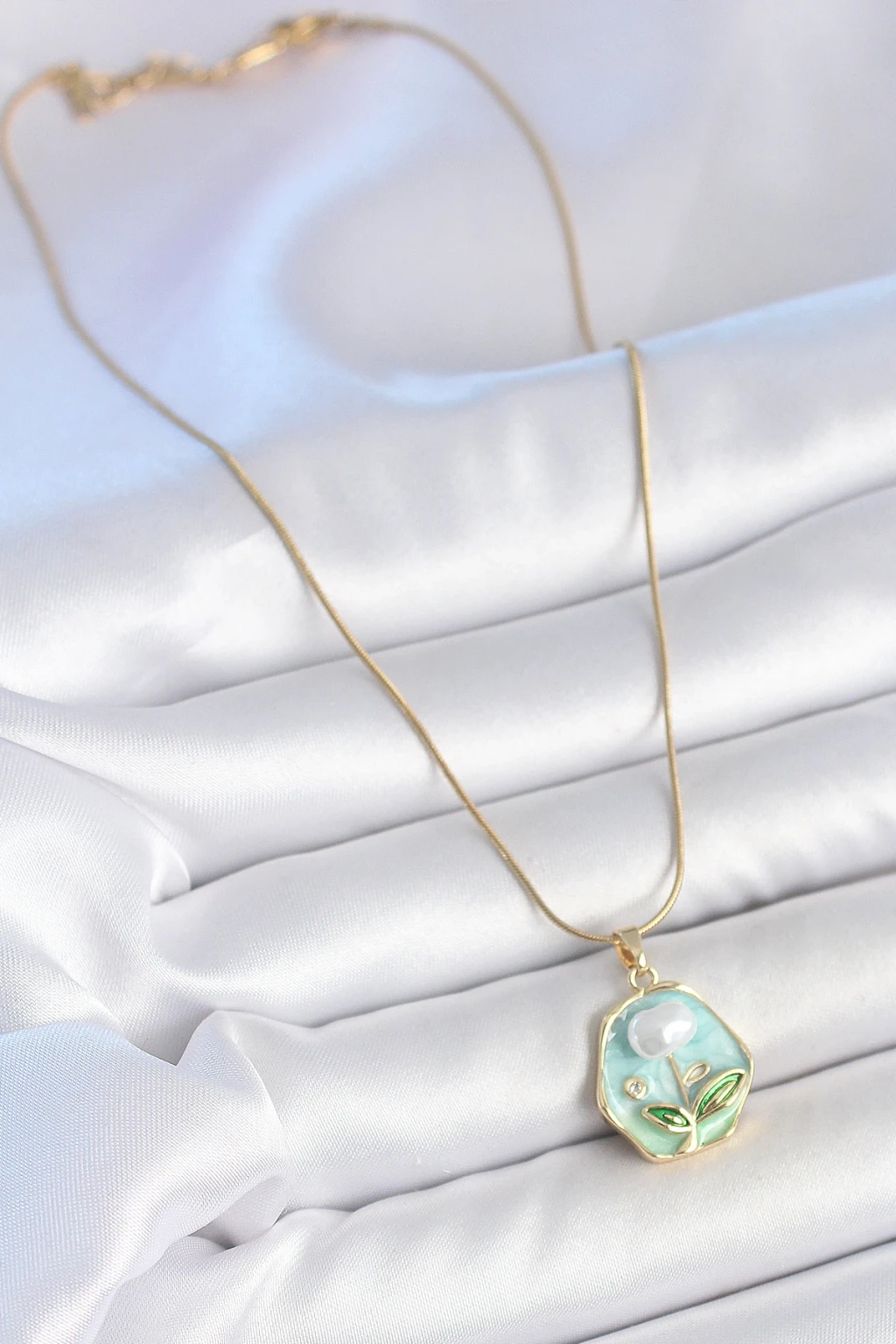 316L Çelik Gold Renk Zincir Mavi Çiçek İşlemeli İnci İşlemeli Portre Model Kadın Kolye - TJ-BKO10126