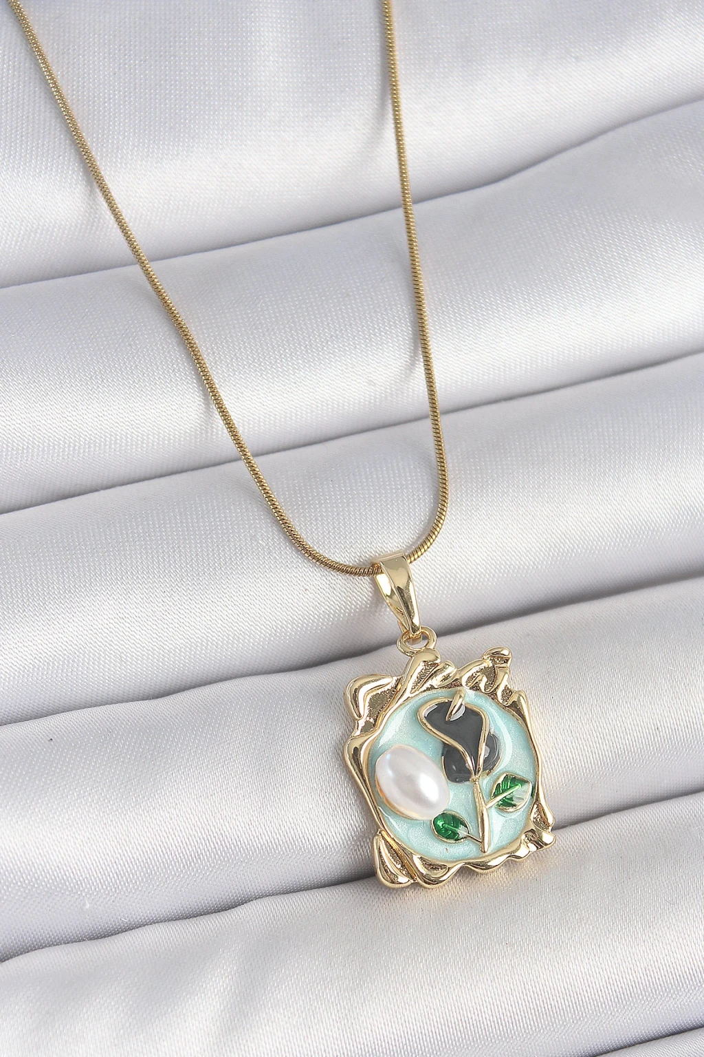 316L Çelik Gold Renk Zincir Mavi Mineli Çiçek İşlemeli İnci Detay Portre Model Kadın Kolye - TJ-BKO10186