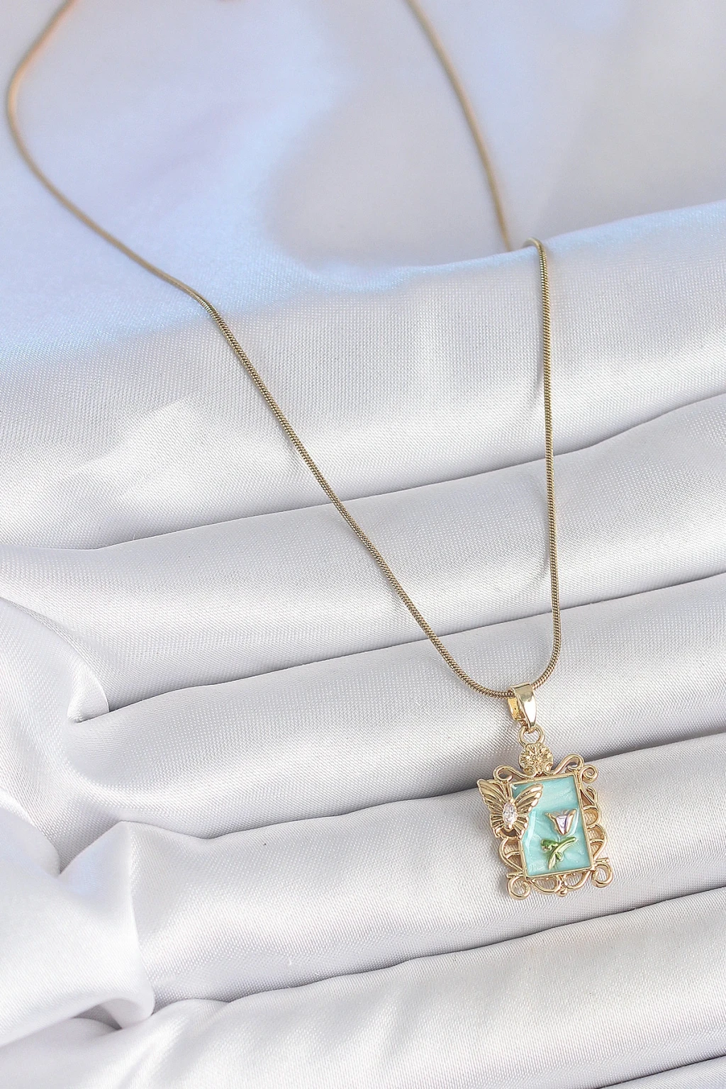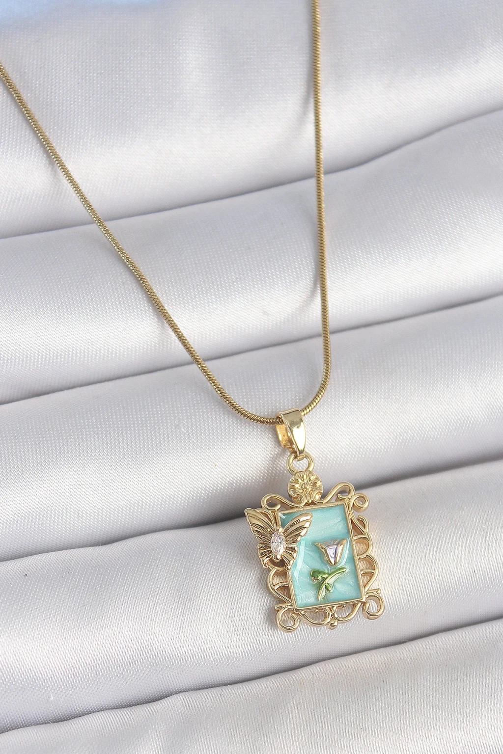 316L Çelik Gold Renk Zincir Mavi Mineli Çiçek İşlemeli Zirkon Taşlı Kelebek Detay Portre Model Kadın Kolye - TJ-BKO10189