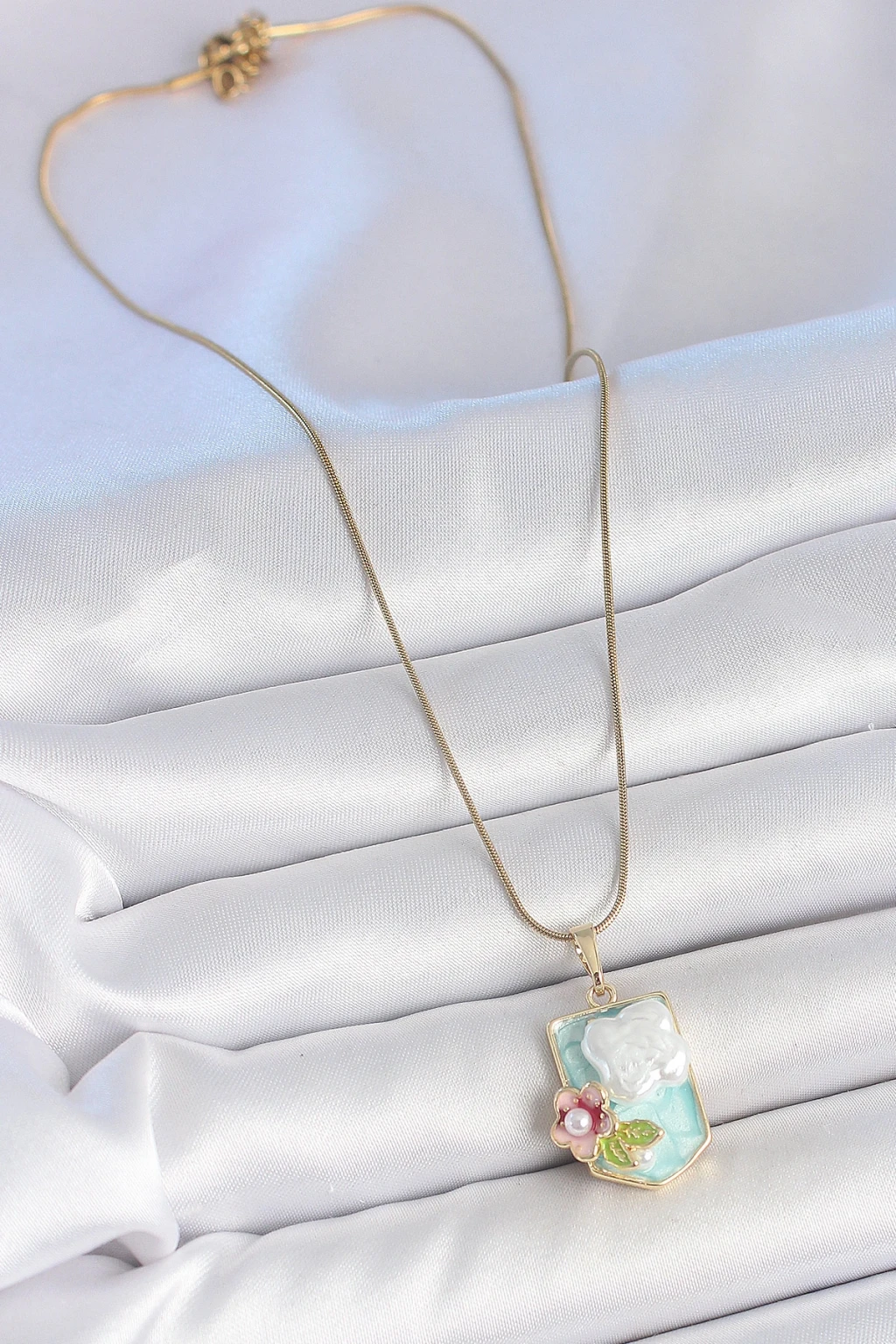 316L Çelik Gold Renk Zincir Mavi Mineli İncili Çiçek İşlemeli Portre Model Kadın Kolye - TJ-BKO10187