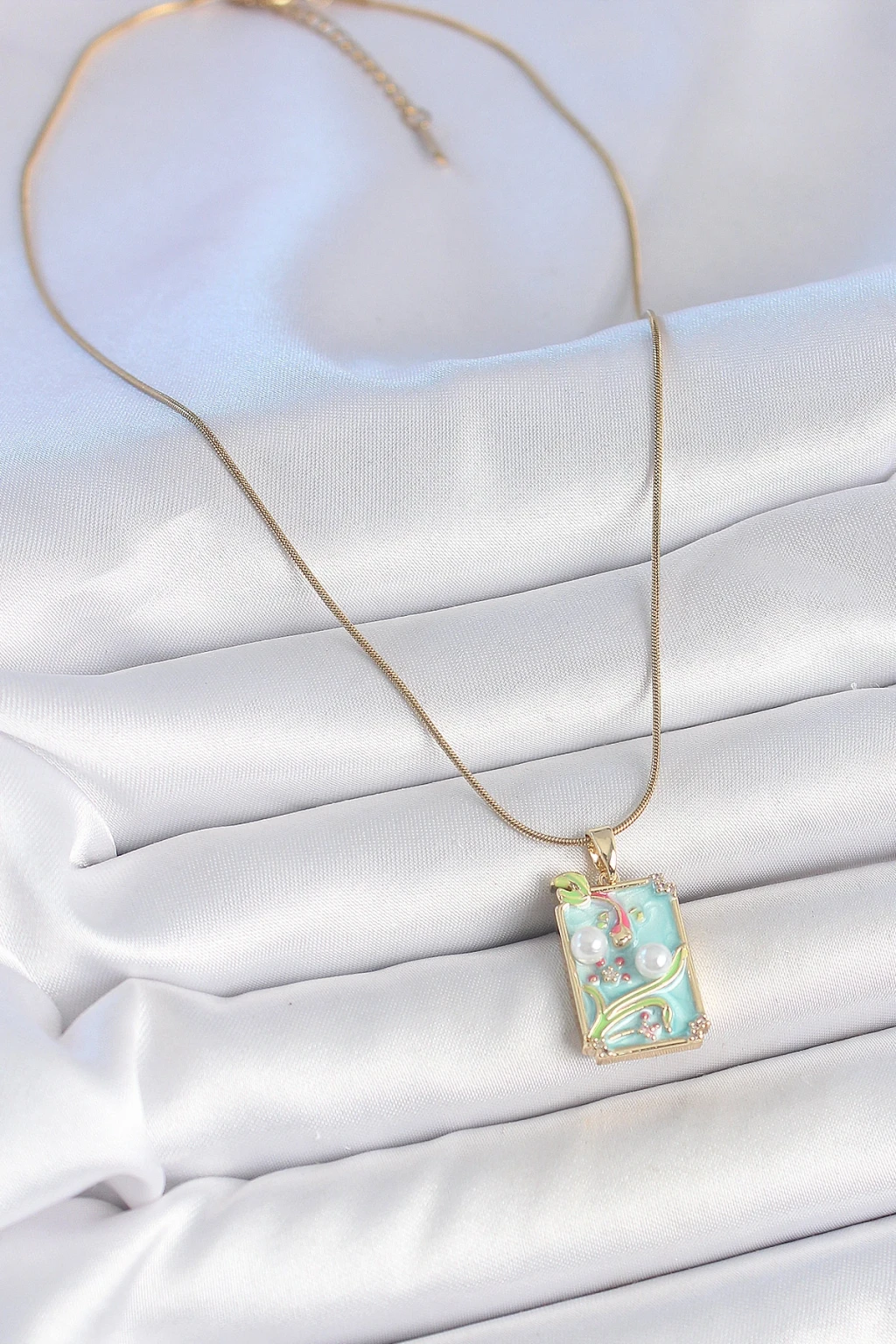 316L Çelik Gold Renk Zincir Mavi Mineli İncili Çiçek İşlemeli Portre Model Kadın Kolye - TJ-BKO10191