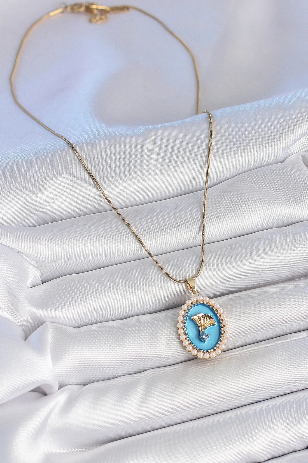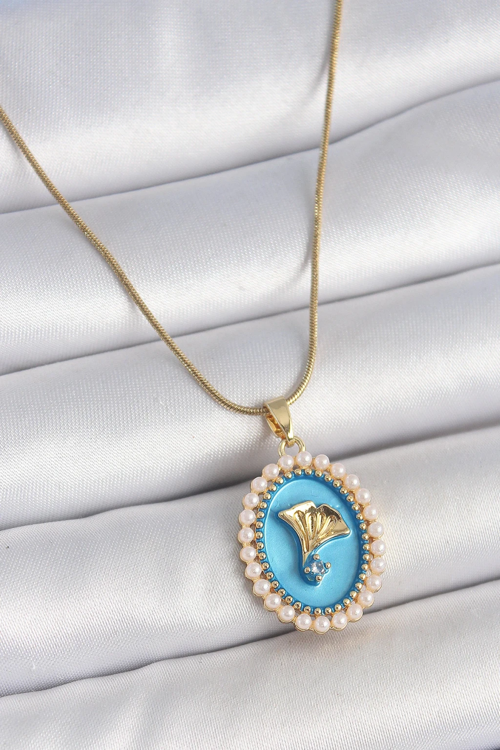 316L Çelik Gold Renk Zincir Mavi Mineli İncili Zirkon Taşlı Çiçek İşlemeli Portre Model Kadın Kolye - TJ-BKO10196
