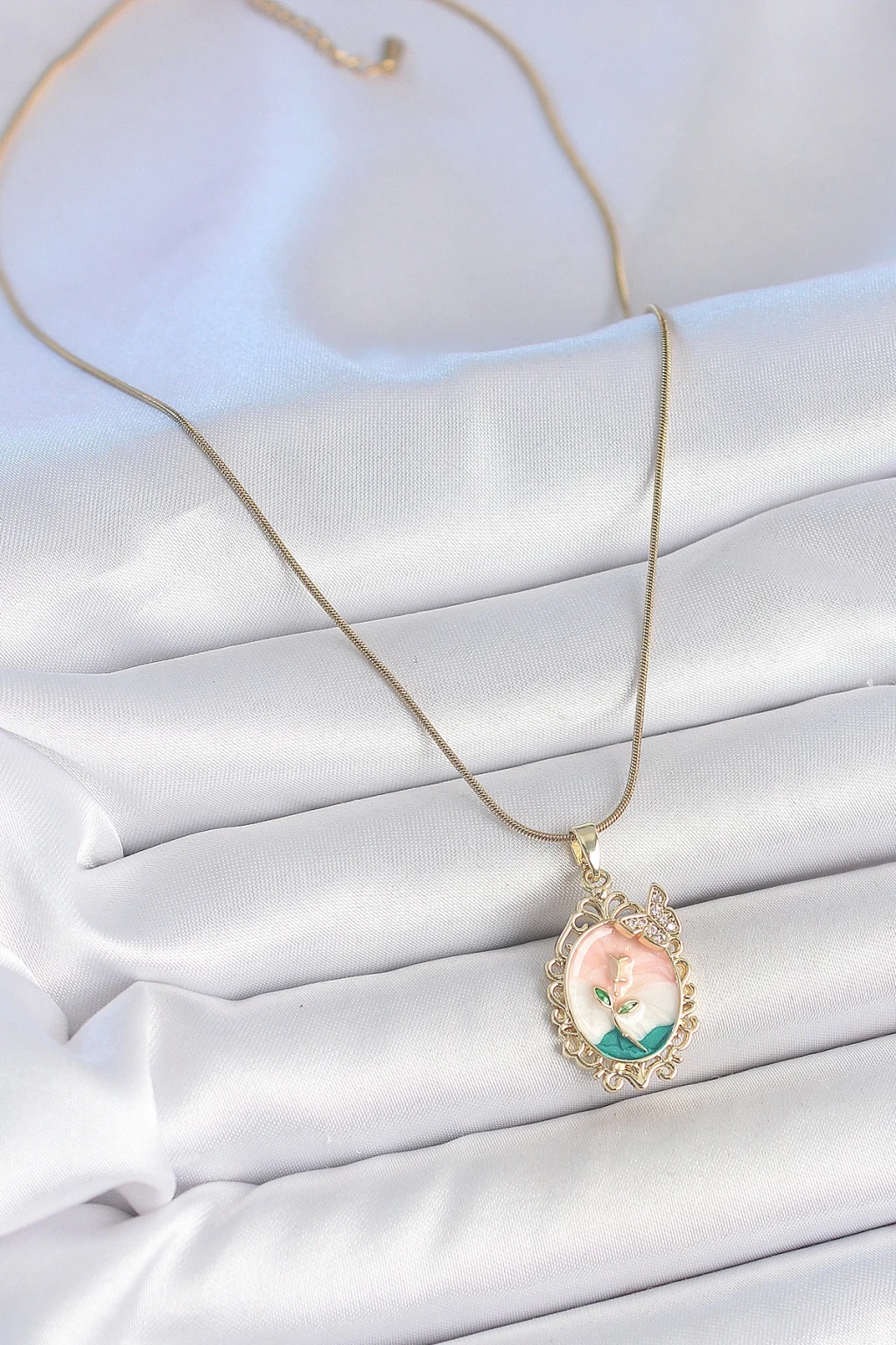 316L Çelik Gold Renk Zincir Mix Renk Çiçek İşlemeli Zirkon Taş Detaylı Portre Model Kadın Kolye - TJ-BKO10182