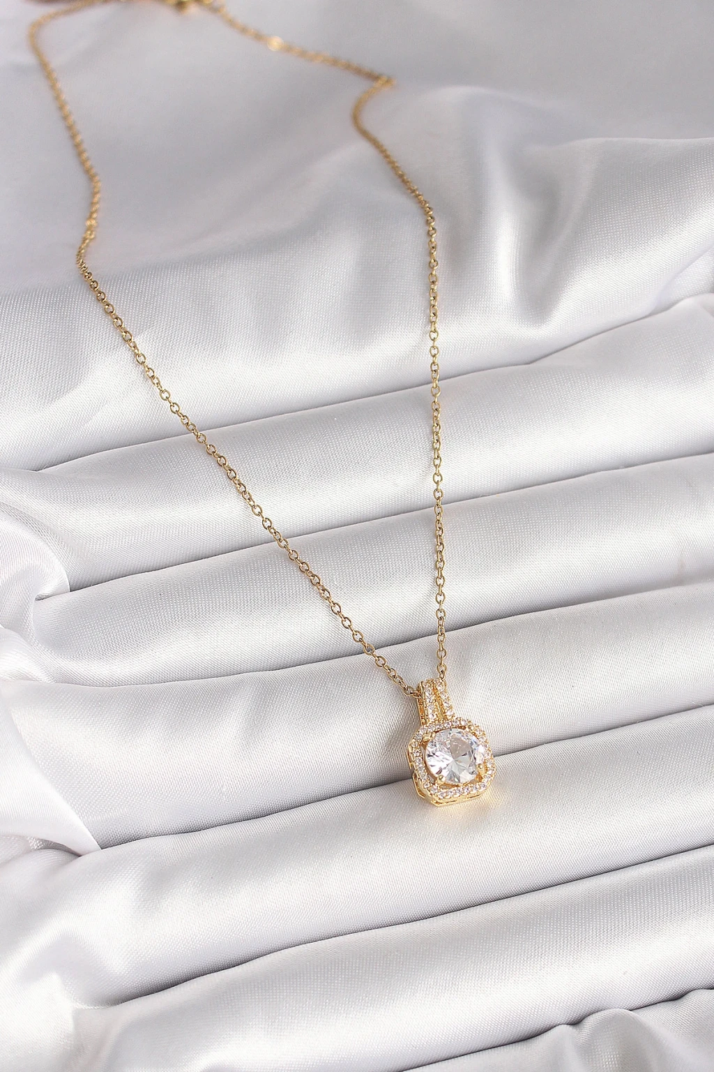 316L Çelik Gold Renk Zincir Zirkon Taşlı Kare Model Kadın Kolye - TJ-BKO9956