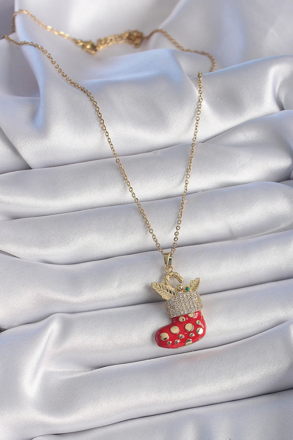 316L Çelik Gold Renk Zincir Zirkon Taşlı Kırmızı Yılbaşı Çorabı Figür Yaprak Detay Kadın Kolye - TJ-BKO9440