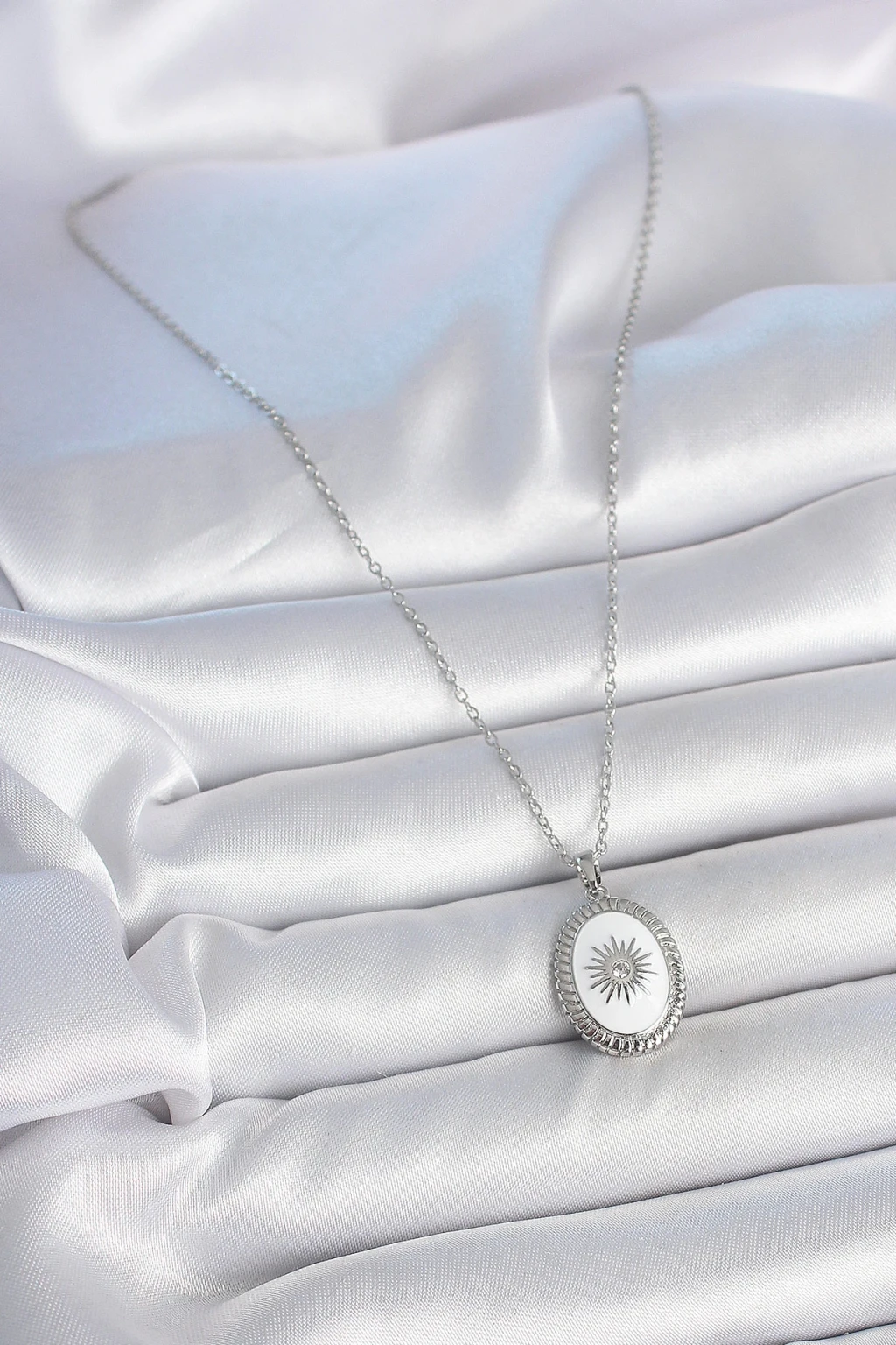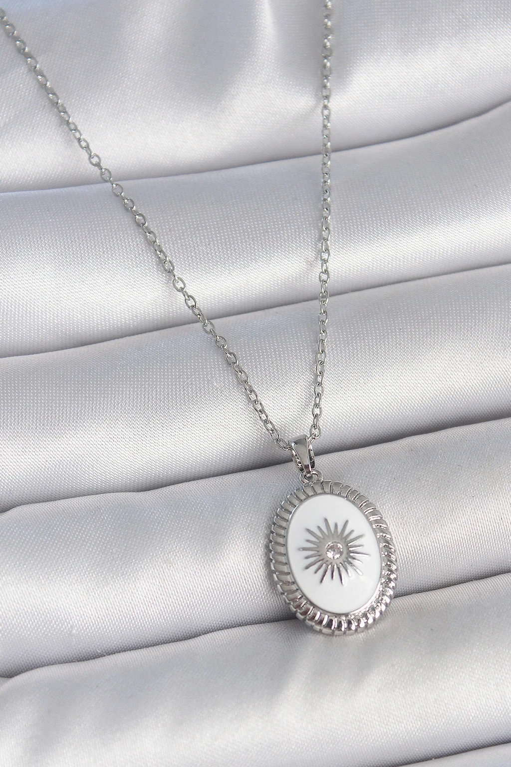 316L Çelik Gümüş Renk Beyaz Mineli Güneş İşlemeli Nazar Boncuk Detay Madalyon Model Kadın Kolye - TJ-BKO10054