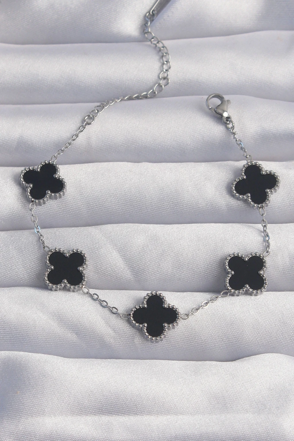 316L Çelik Gümüş Renk Siyah Mineli Yonca Bileklik - TJ-BB6257