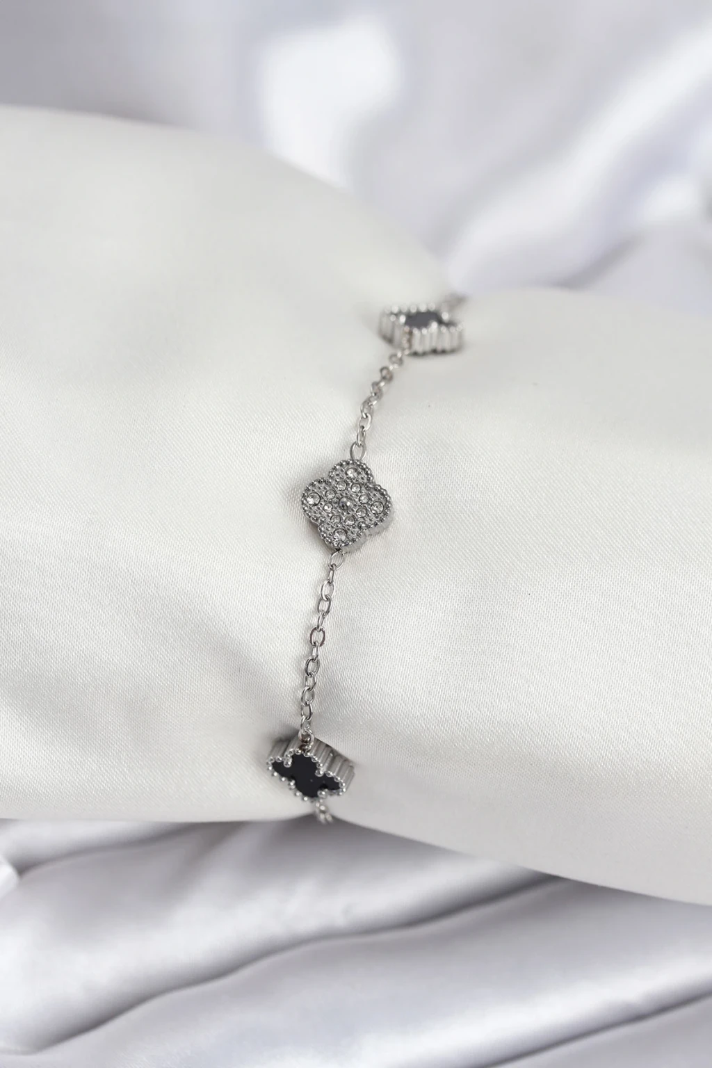 316L Çelik Gümüş Renk Siyah ve Zirkon Taşlı Baby Boy Yonca Kadın Bileklik - TJ-BB7954