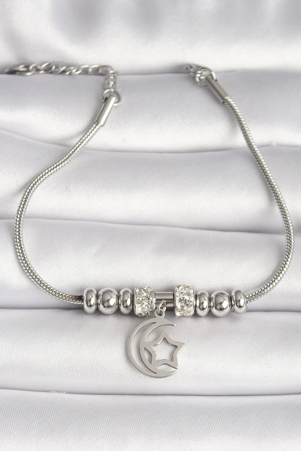 316L Çelik Gümüş Renk Tüp Zincir Zirkon Taş Detaylı Sallantı Ay Yıldız Figür Kadın Bileklik - TJ-BB6754