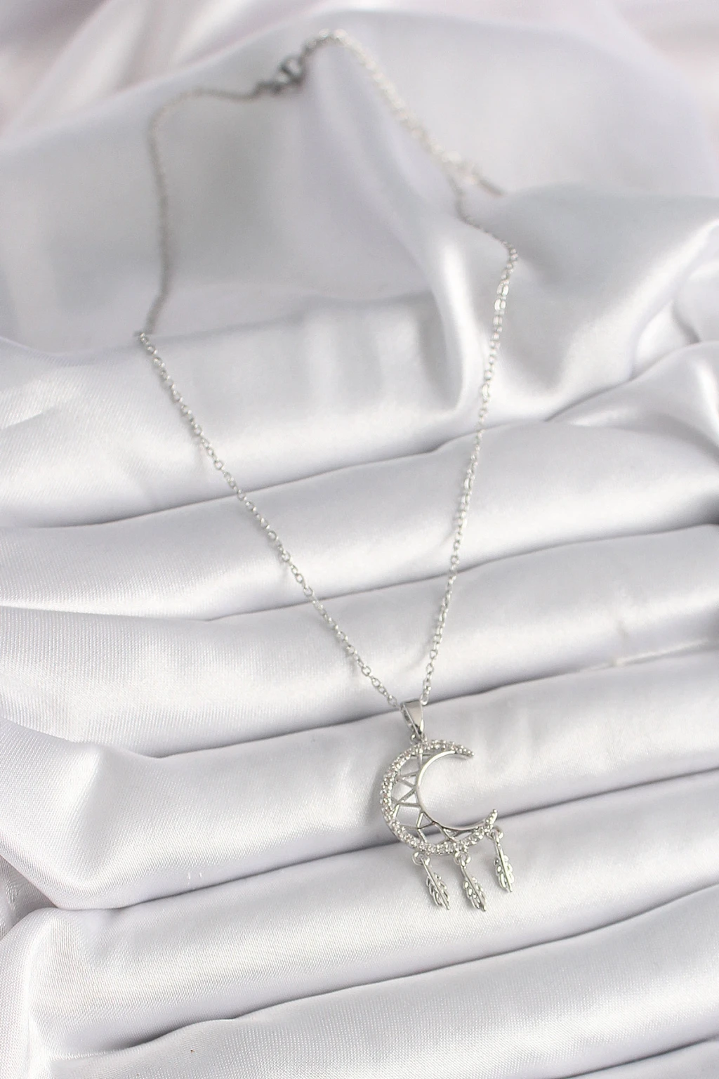316L Çelik Gümüş Renk Zincir Zirkon Taşlı Hilal Model Sallantı Yaprak Detay Kadın Kolye - TJ-BKO9651