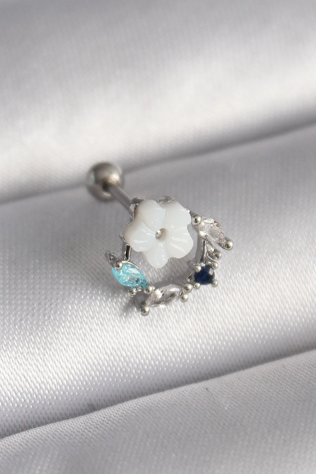 316L Çelik Gümüş Renk Zirkon Taş Detay Beyaz Çiçek Model Tragus Piercing - TJ-PR1359