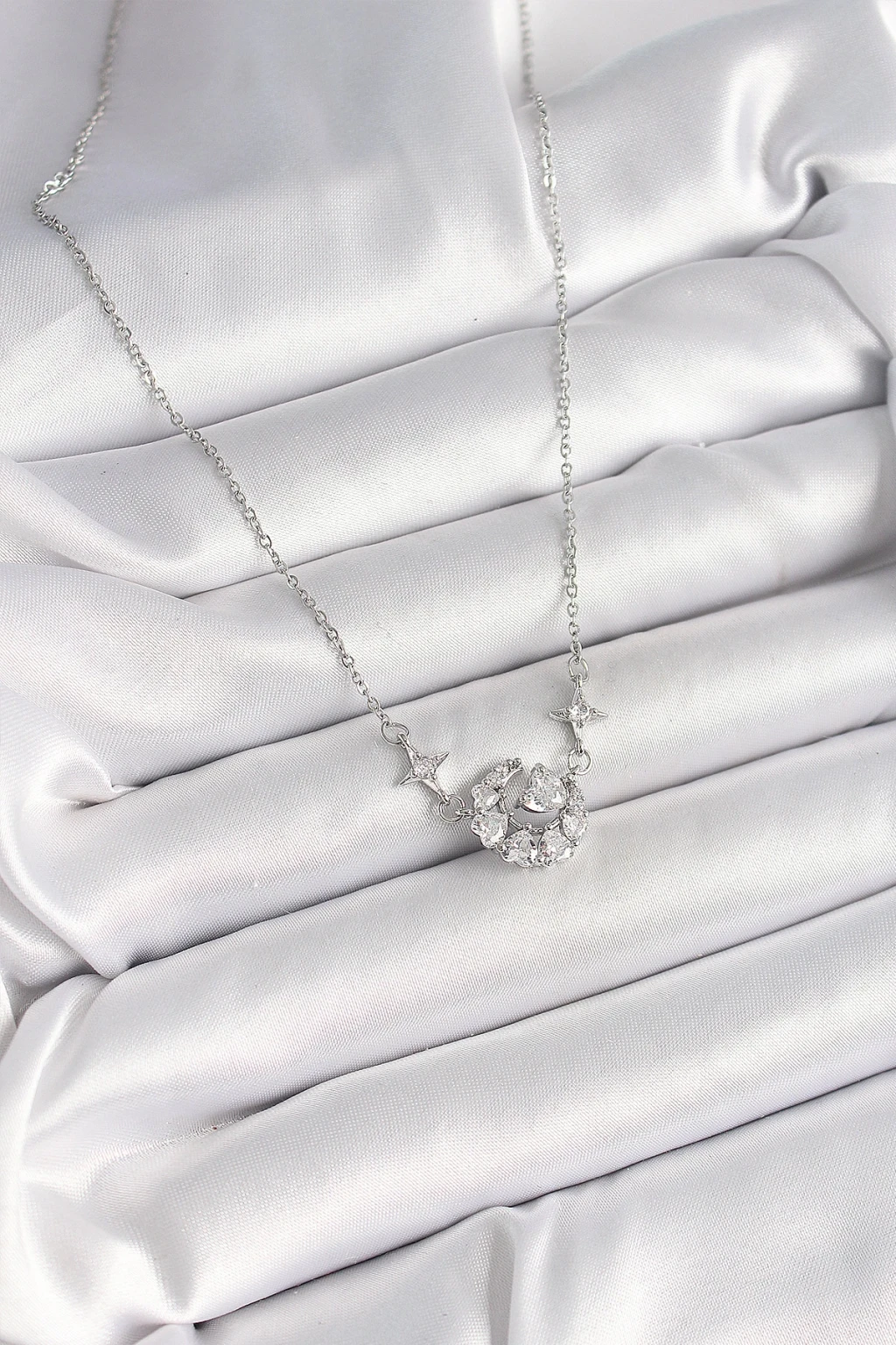 316L Çelik Gümüş Renk Zirkon Taşlı Hilal Kalp Model Kadın Kolye - TJ-BKO9929