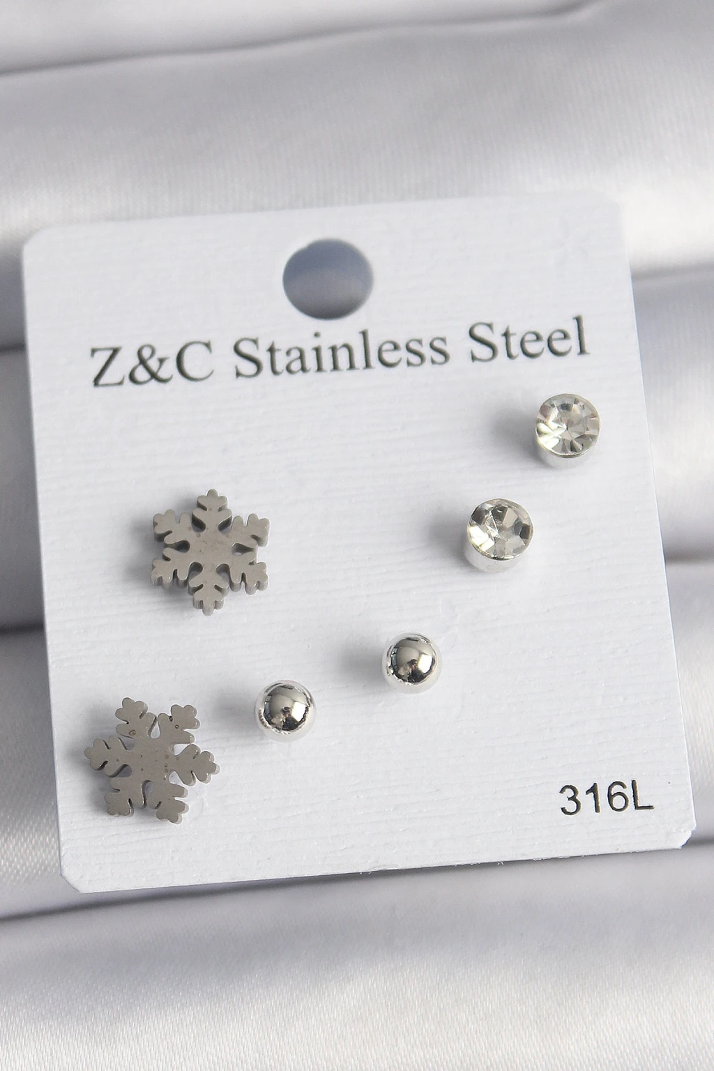 316L Çelik Gümüş Renk Zirkon Taşlı Kar Tanesi Model Kadın Küpe Seti - TJ-BKP10014