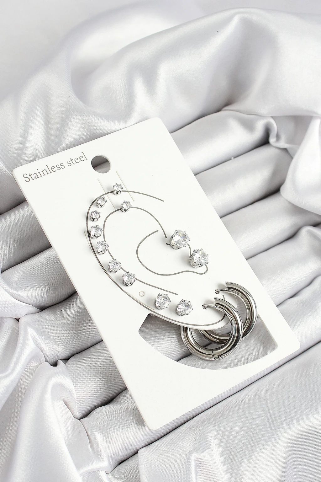 316L Çelik Halka Figürlü Ve Zirkon Taşlı Gümüş Renk 7'li Çift Kadın Küpe Set - TJ-BKP10637