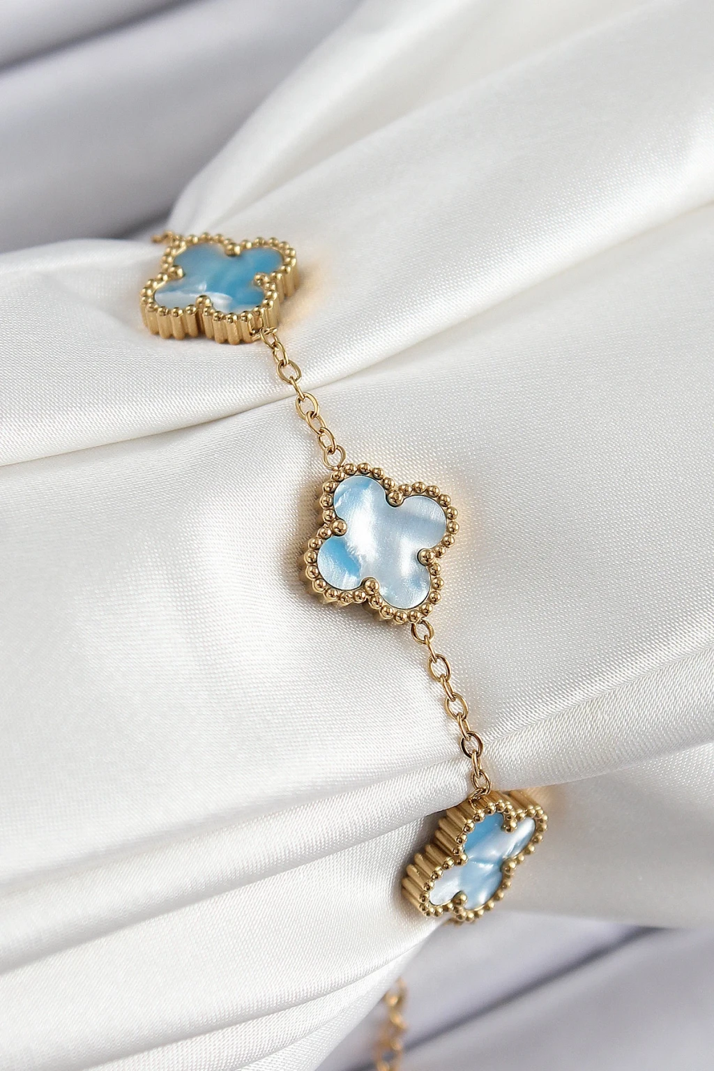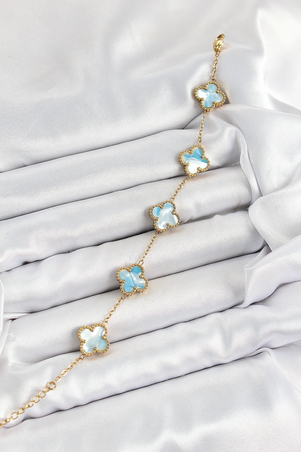 316L Çelik Mavi Sedef Yonca Model Gold Renk Kadın Bileklik - TJ-BB7366