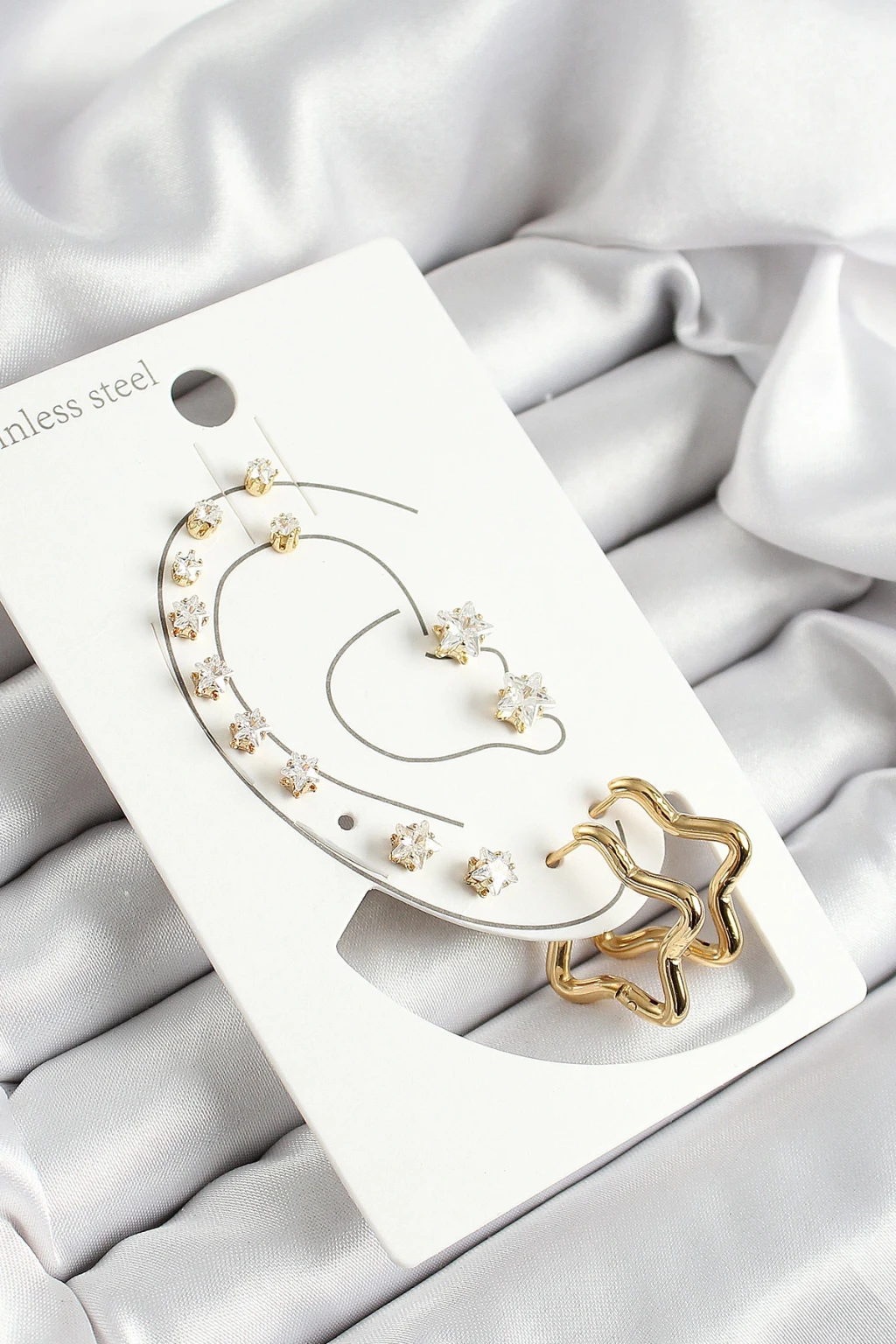 316L Çelik Yıldız Figürlü Ve Zirkon Taşlı Gold Renk 7'li Çift Kadın Küpe Set - TJ-BKP10640