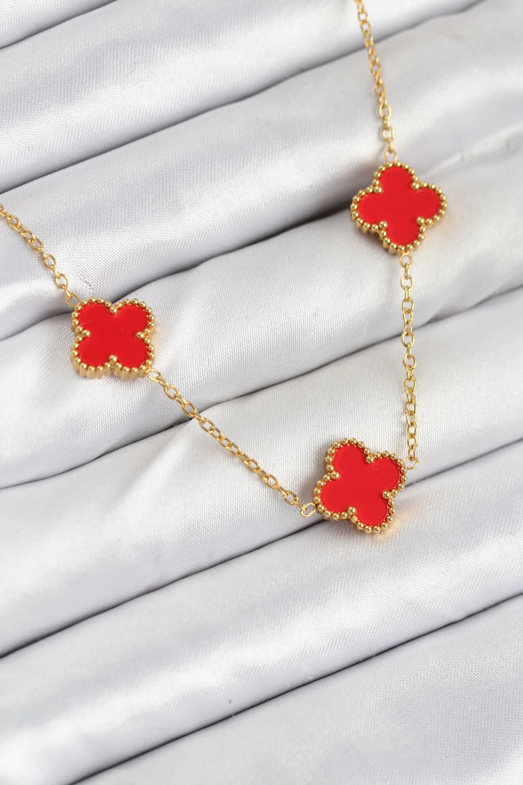 316L Çelik Zincir Gold Kırmızı Renk Yonca Kadın Kolye - TJ-BKO10585