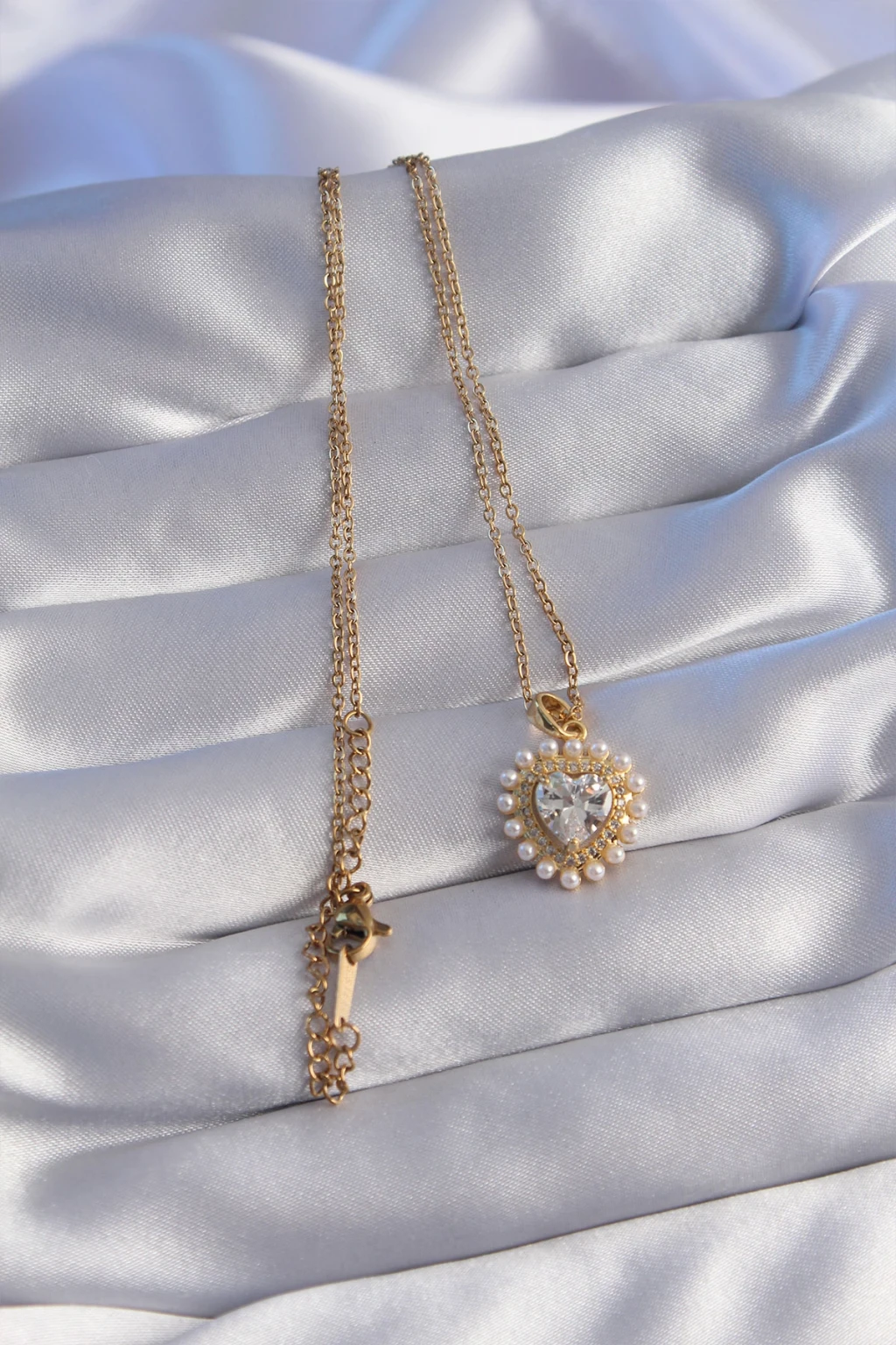 316L Çelik Zincir Gold Renk İncili Zirkon Taşlı Kalp Tasarımlı Kolye - TJ-BKO8762