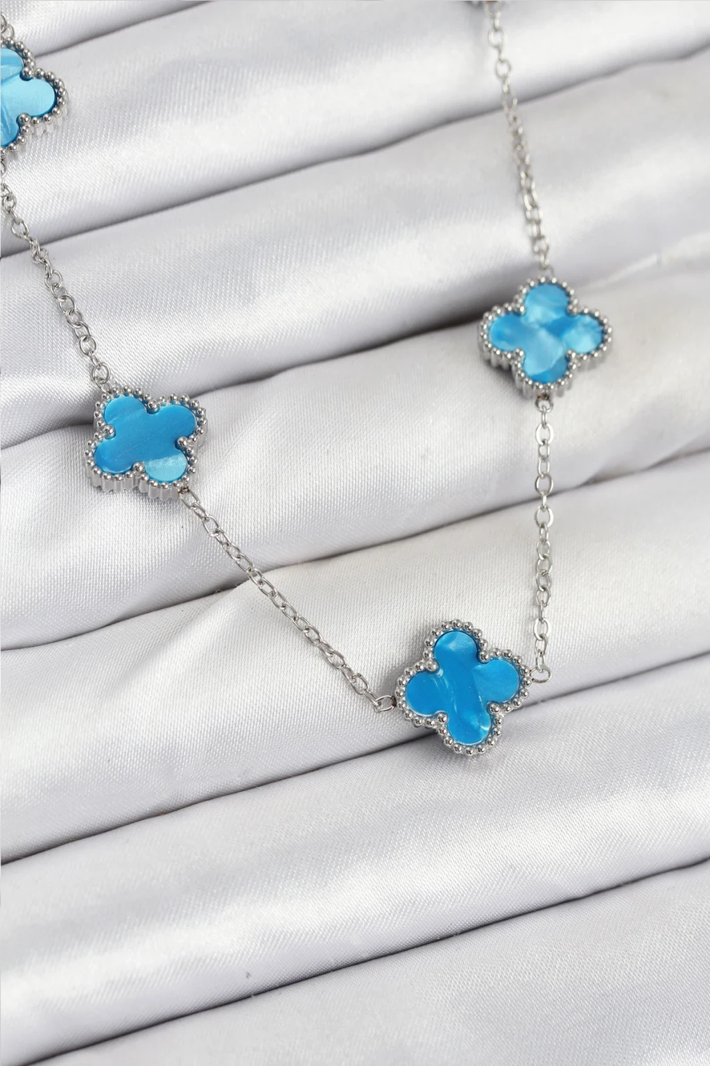 316L Çelik Zincir Gümüş Buz Mavisi Renk Yonca Kadın Kolye - TJ-BKO10582
