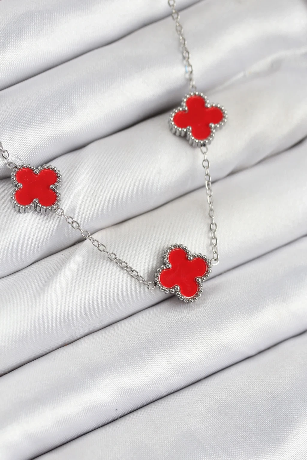 316L Çelik Zincir Gümüş Kırmızı Renk Yonca Kadın Kolye - TJ-BKO10586