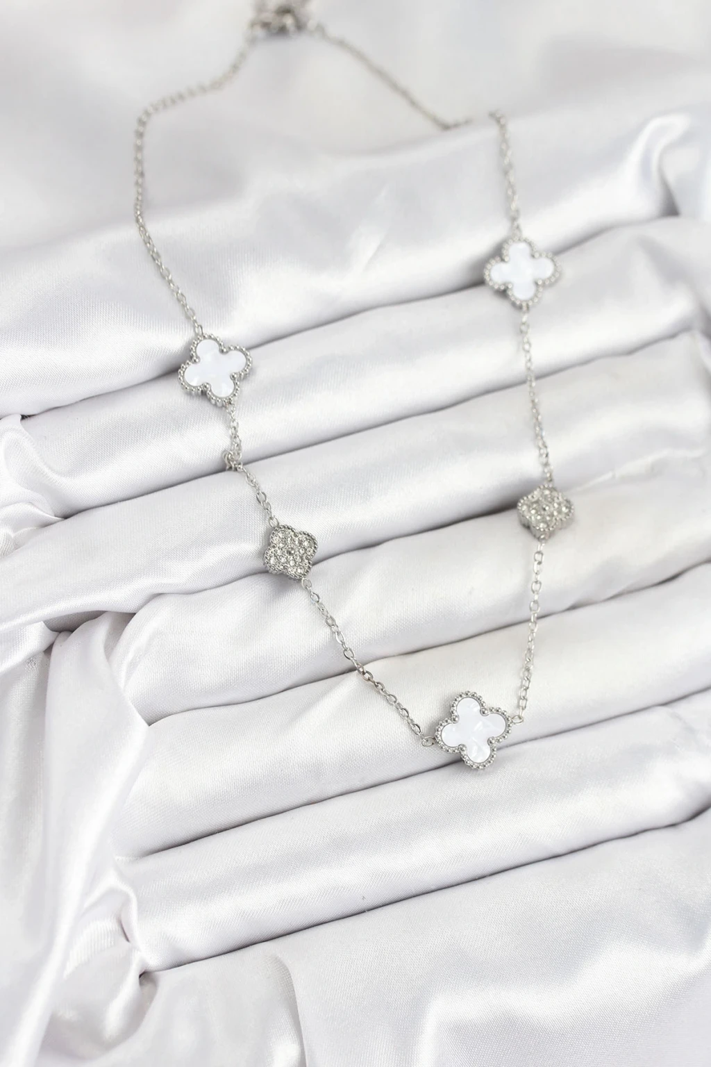 316L Çelik Zincir Gümüş Renk Beyaz ve Zirkon Taşlı Yonca Kadın Kolye - TJ-BKO10588