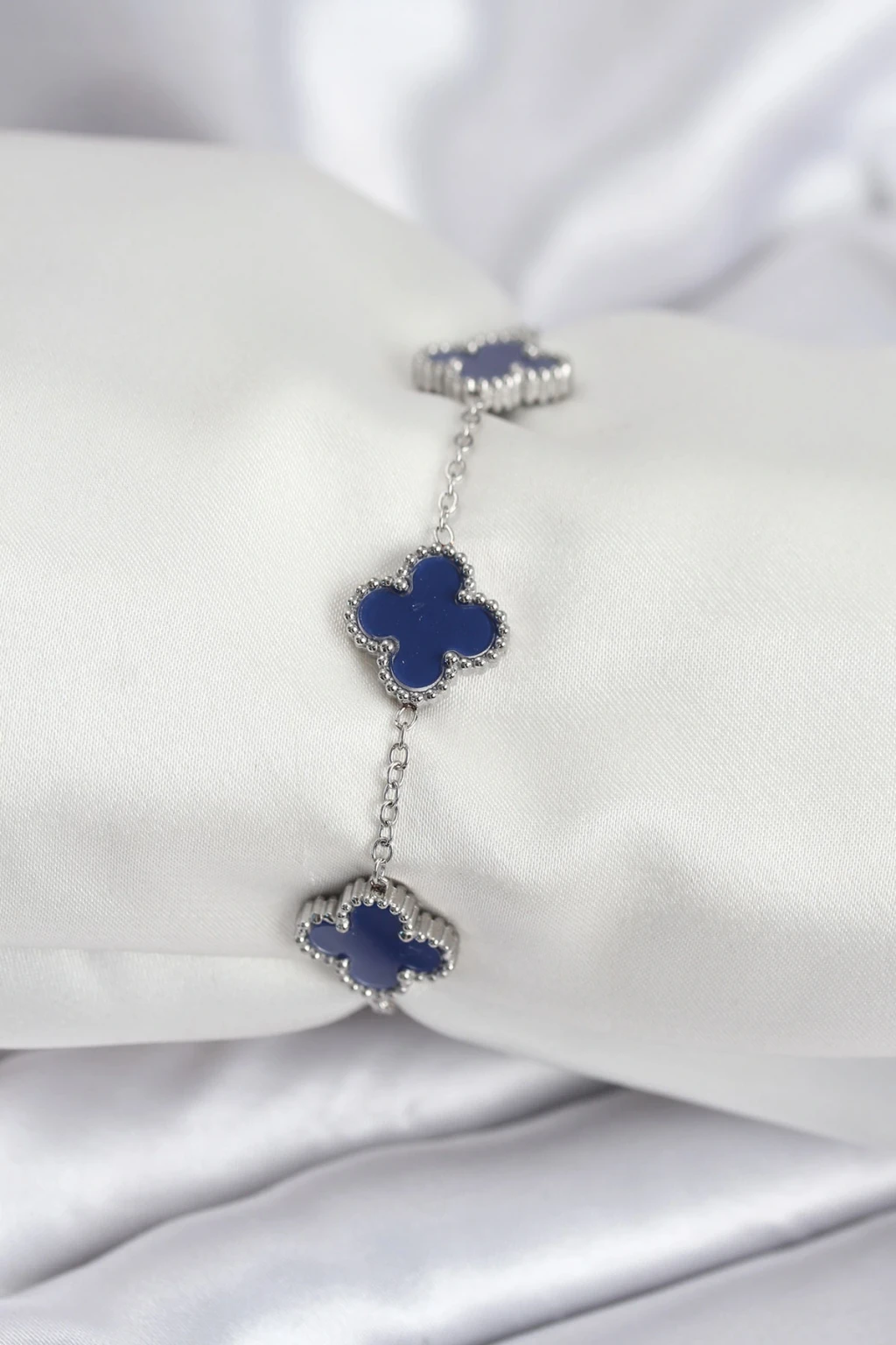 316L Çelik Zincir Gümüş Renk Lacivert Yonca Kadın Bileklik - TJ-BB7958
