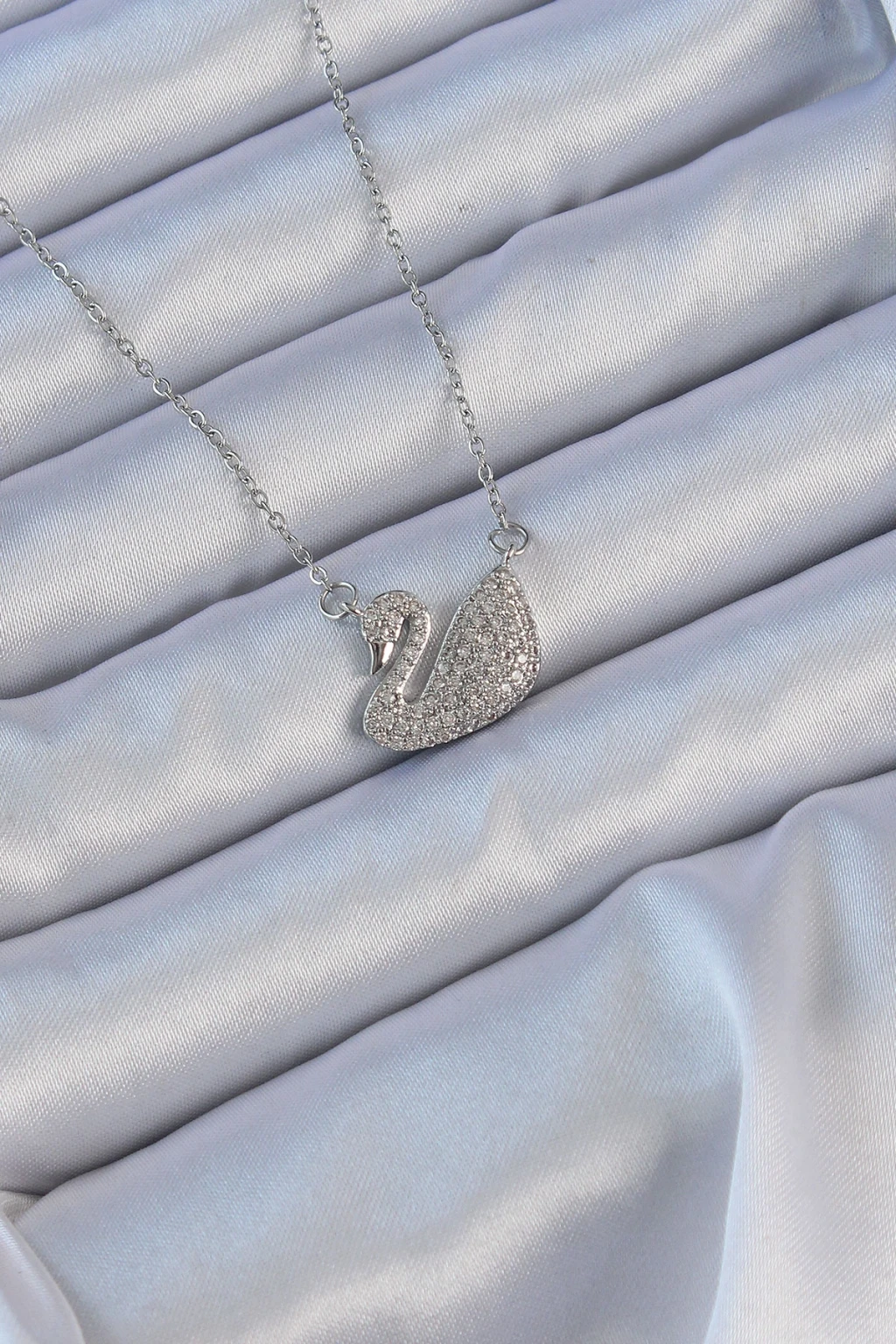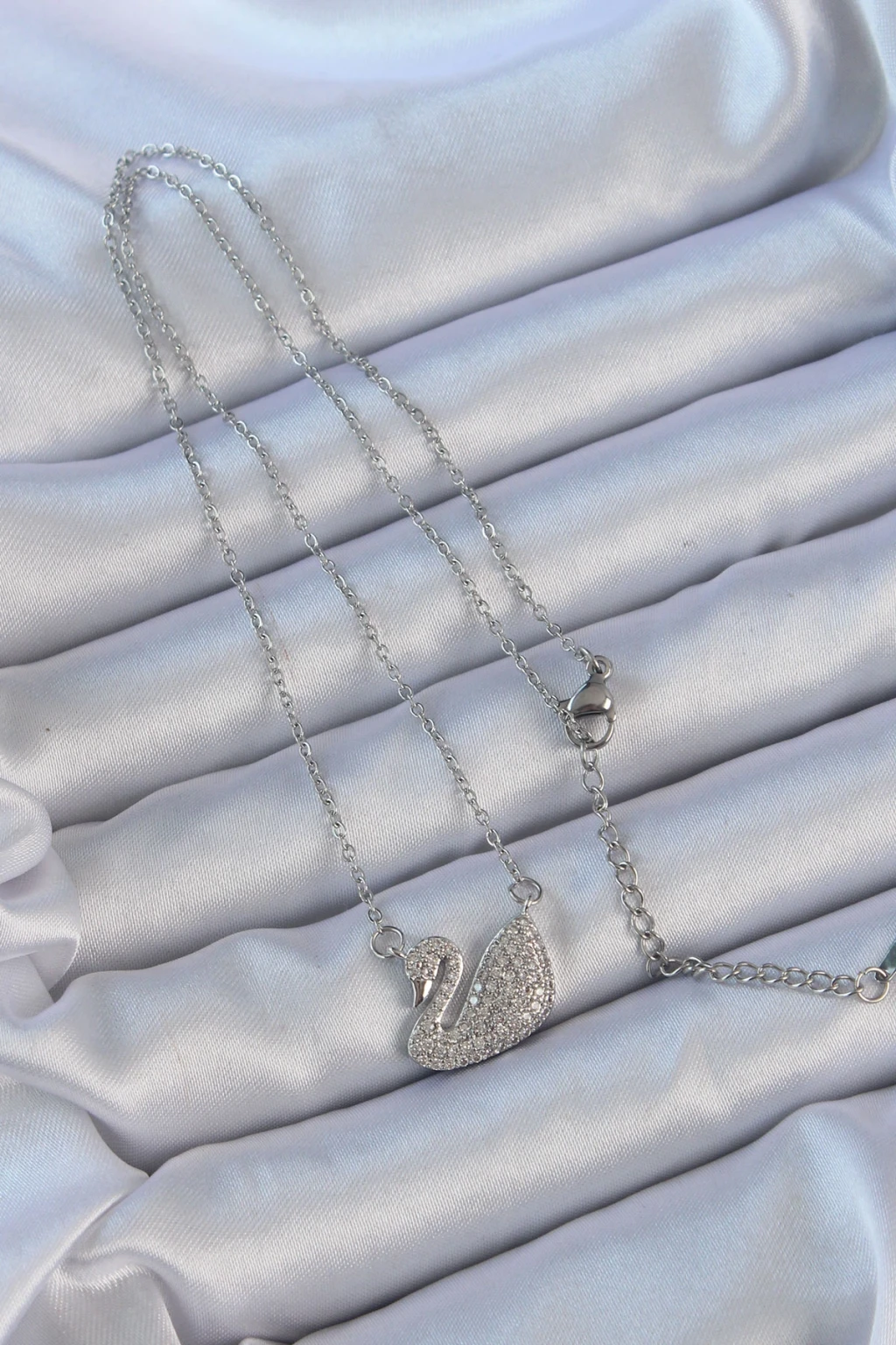 316L Çelik Zincir Gümüş Renk Zirkon Taşlı Kuğu Kolye - TJ-BKO9150