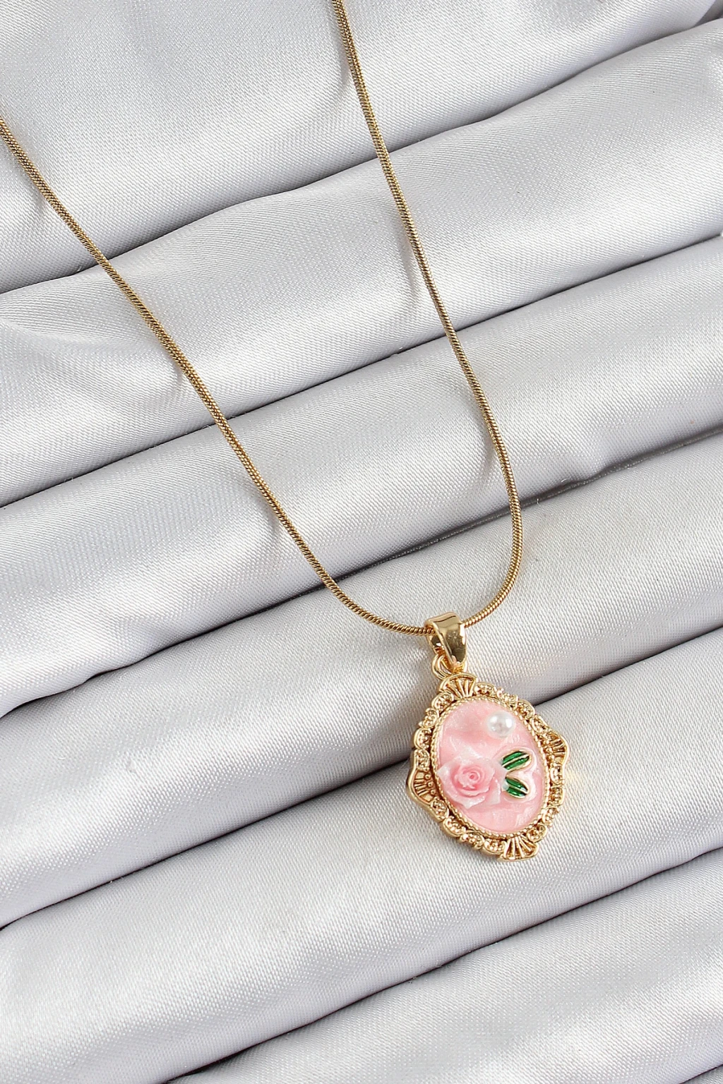 316L Çelik Zincir Pembe Sanatsal Portre İnci Detaylı Gül Figürlü Model Gold Renk Kadın Kolye - TJ-BKO10281