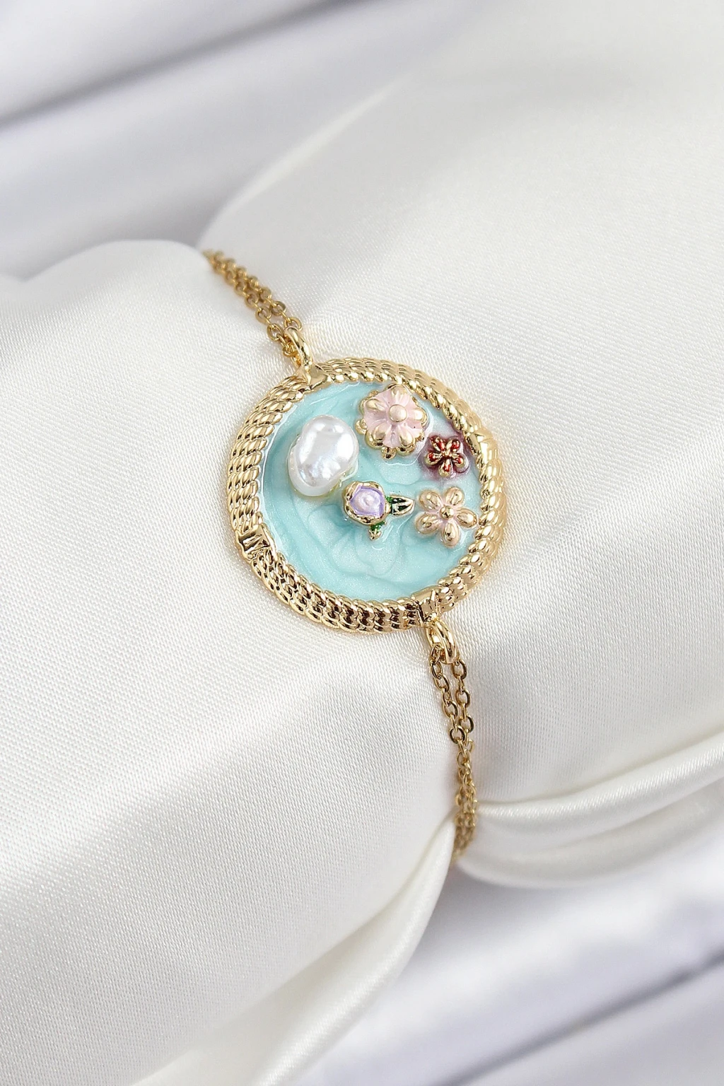 316L Çelik Zincir Turkuaz Mineli Sanatsal Portre İnci Detaylı Çiçek Model Gold Renk Kadın Bileklik - TJ-BB7227