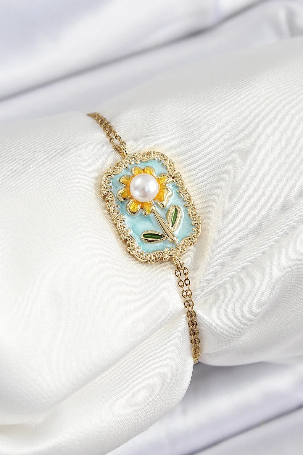 316L Çelik Zincir Turkuaz Mineli Sanatsal Portre İnci Detaylı Papatya Model Gold Renk Kadın Bileklik - TJ-BB7230