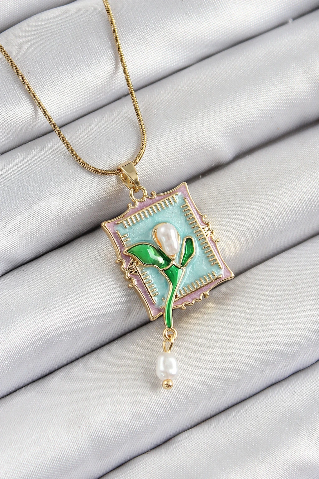 316L Çelik Zincir Turkuaz Sanatsal Portre Sallantılı İnci Detaylı Lale Model Gold Renk Kadın Kolye - TJ-BKO10280