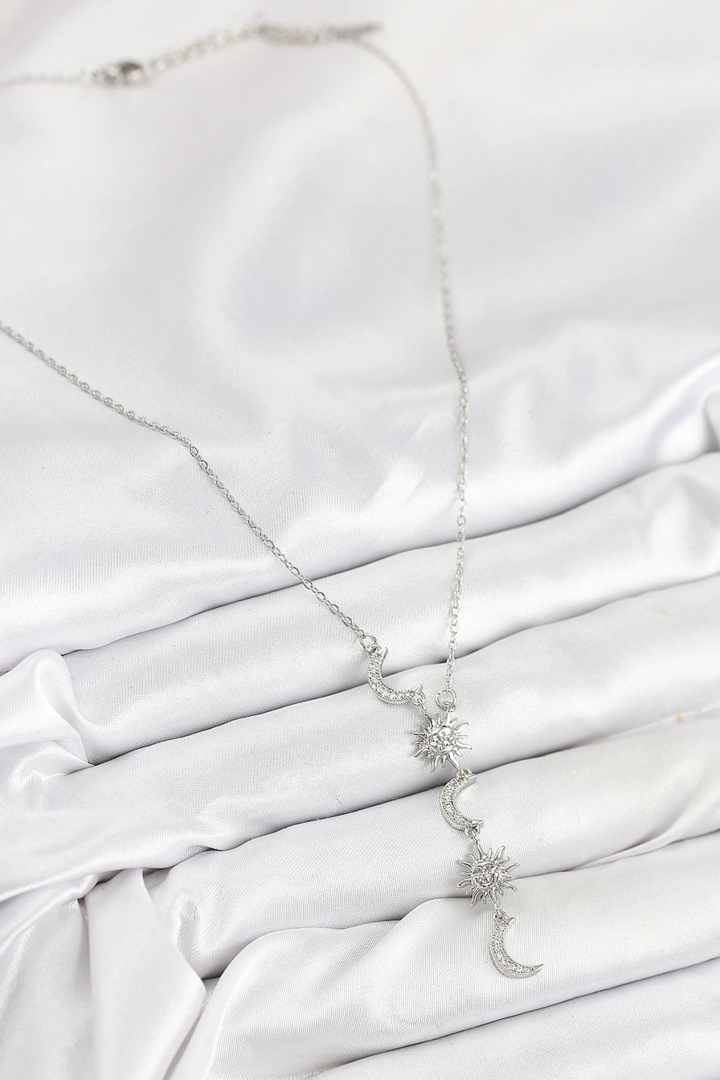 316L Çelik Zirkon Taşlı Güneş Ve Ay Model Gümüş Renk Kadın Kolye - TJ-BKO10549