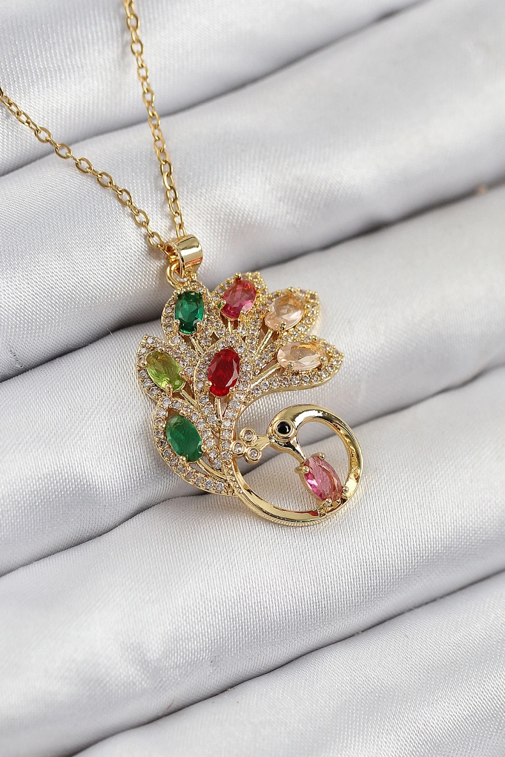 316L Çelik Zirkon Taşlı Tavus Kuşu Model Gold Renk Kadın Kolye - TJ-BKO10514