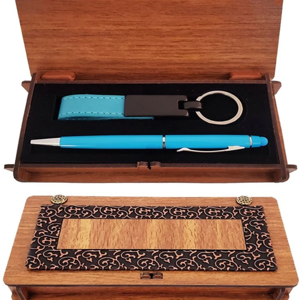 Ahşap Kutulu Kalem ve Anahtarlık Mavi Set