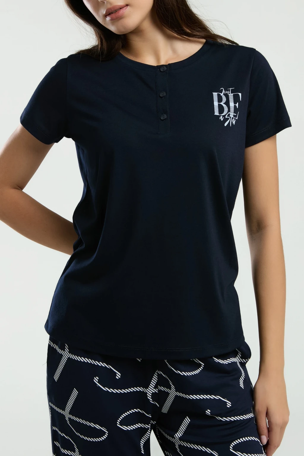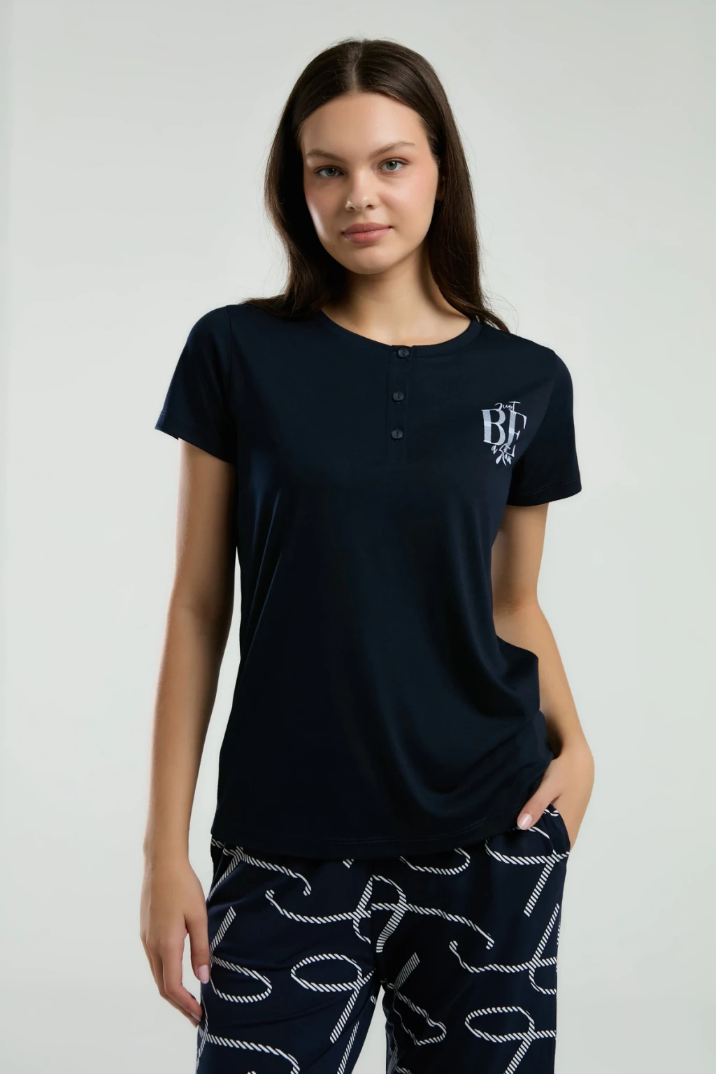 Siyah Likralı Düğmeli Yumuşacık 2li Pijama Takımı