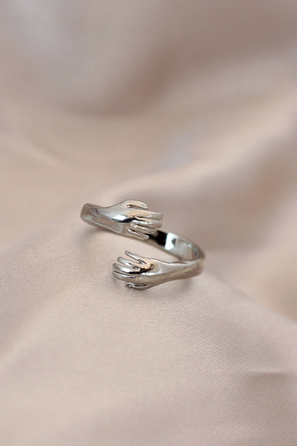 Ayarlamalı Gümüş Renk Metal Sarılan Eller Model Yüzük - TJ-BYK2061