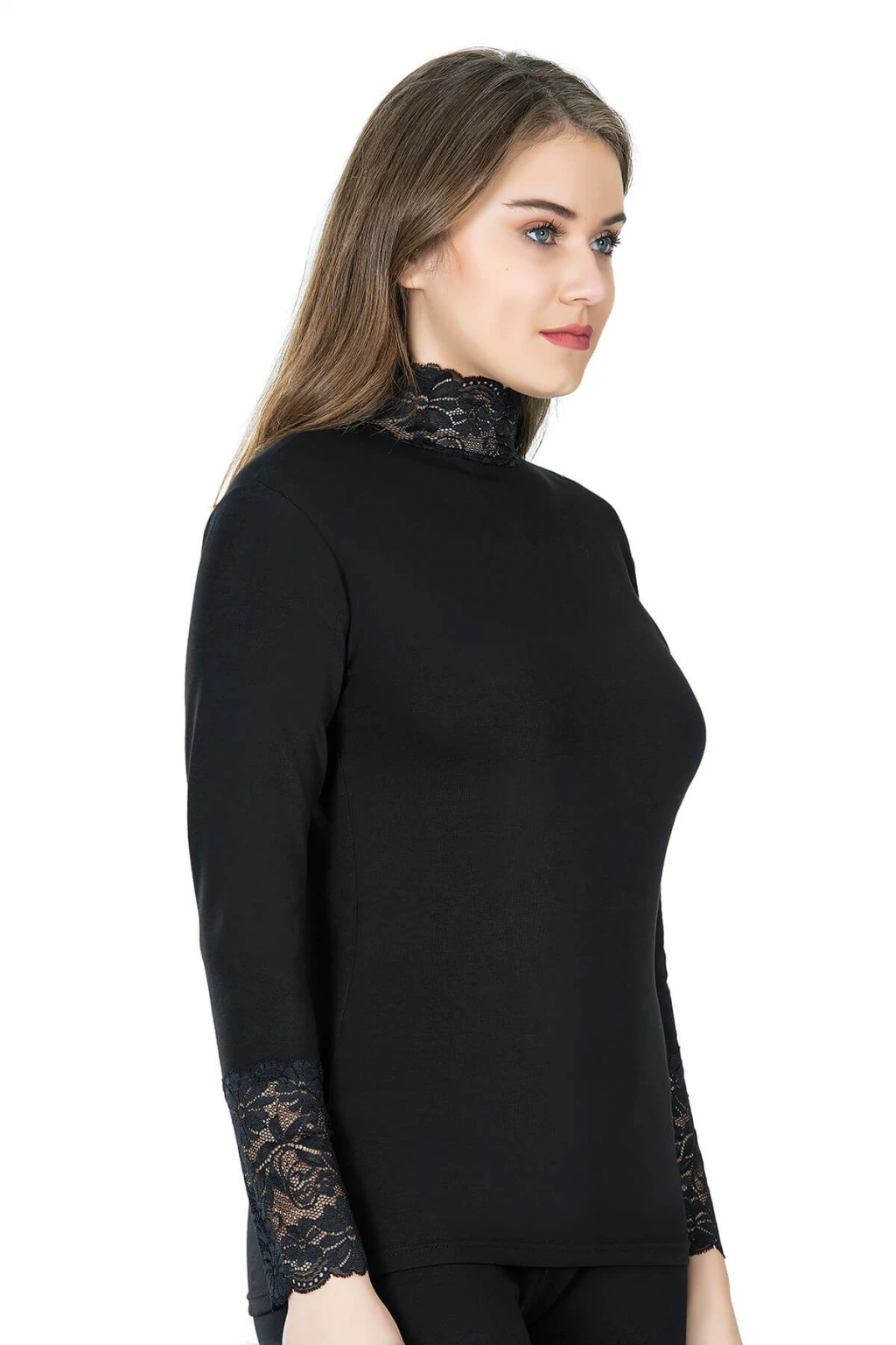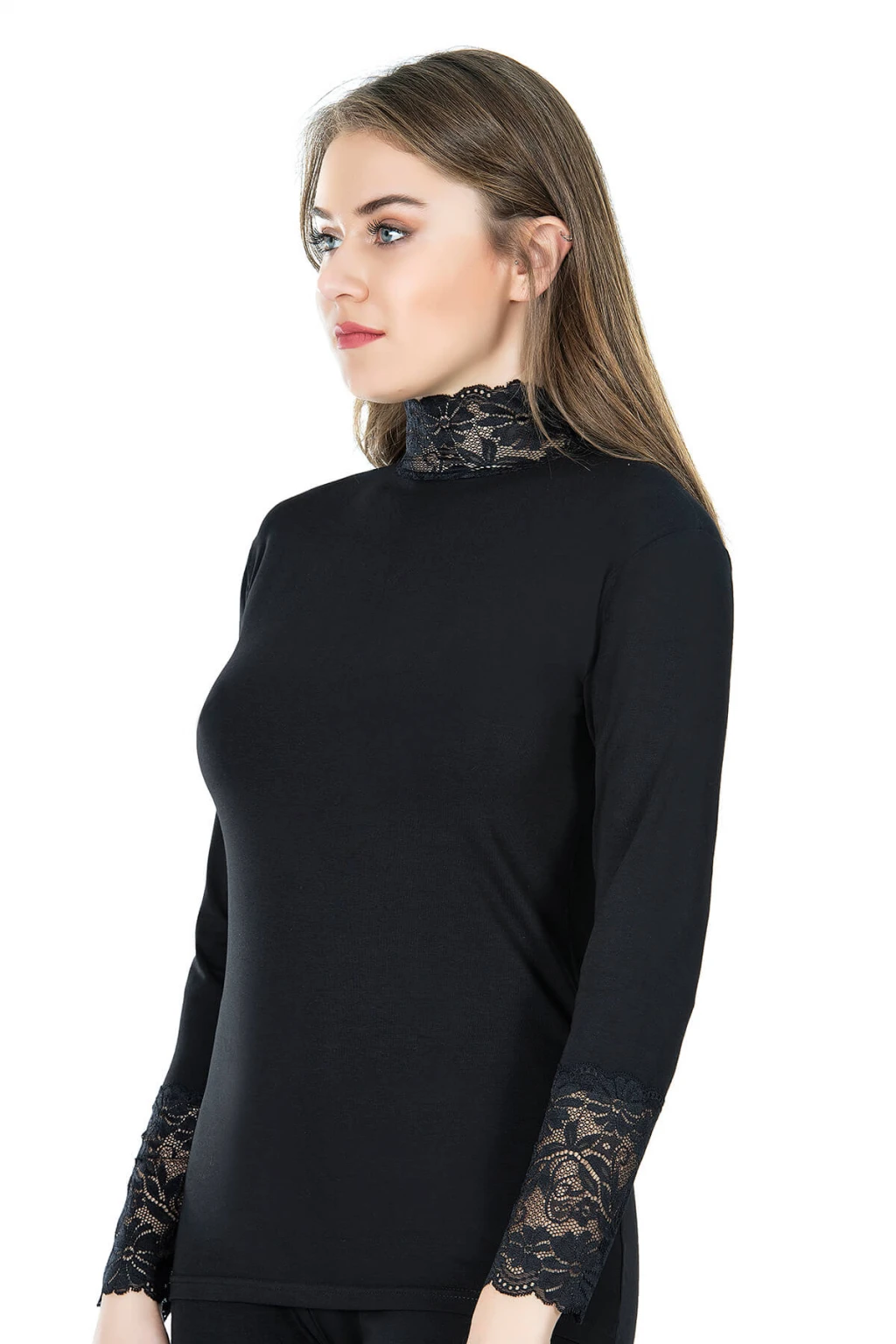 Uzun kollu balıkçı yaka, dantel detaylı çok şık kadın tişört modelidir.