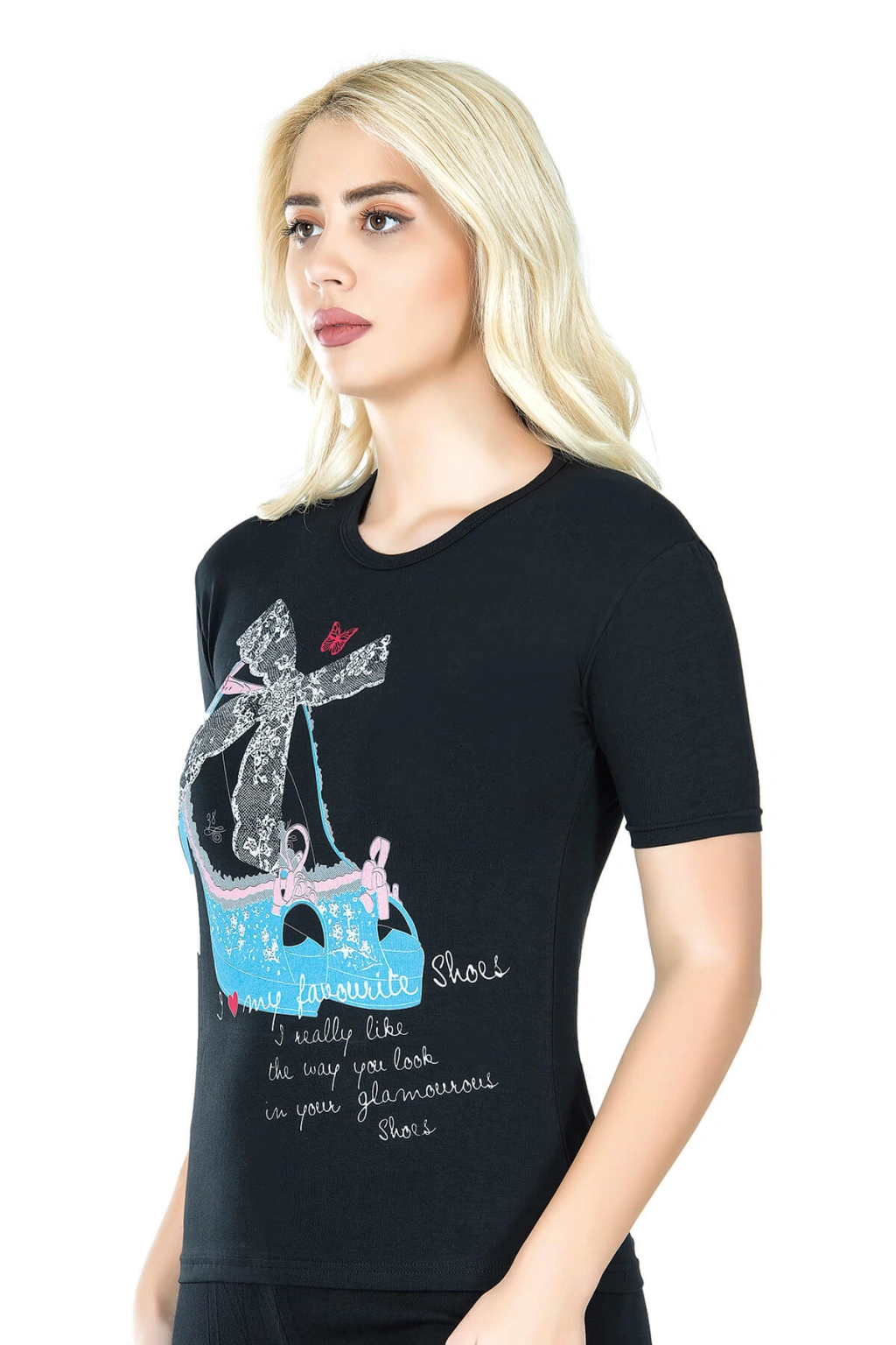 Babet baskılı bisiklet yaka yarım kollu kadın tişört modelidir.