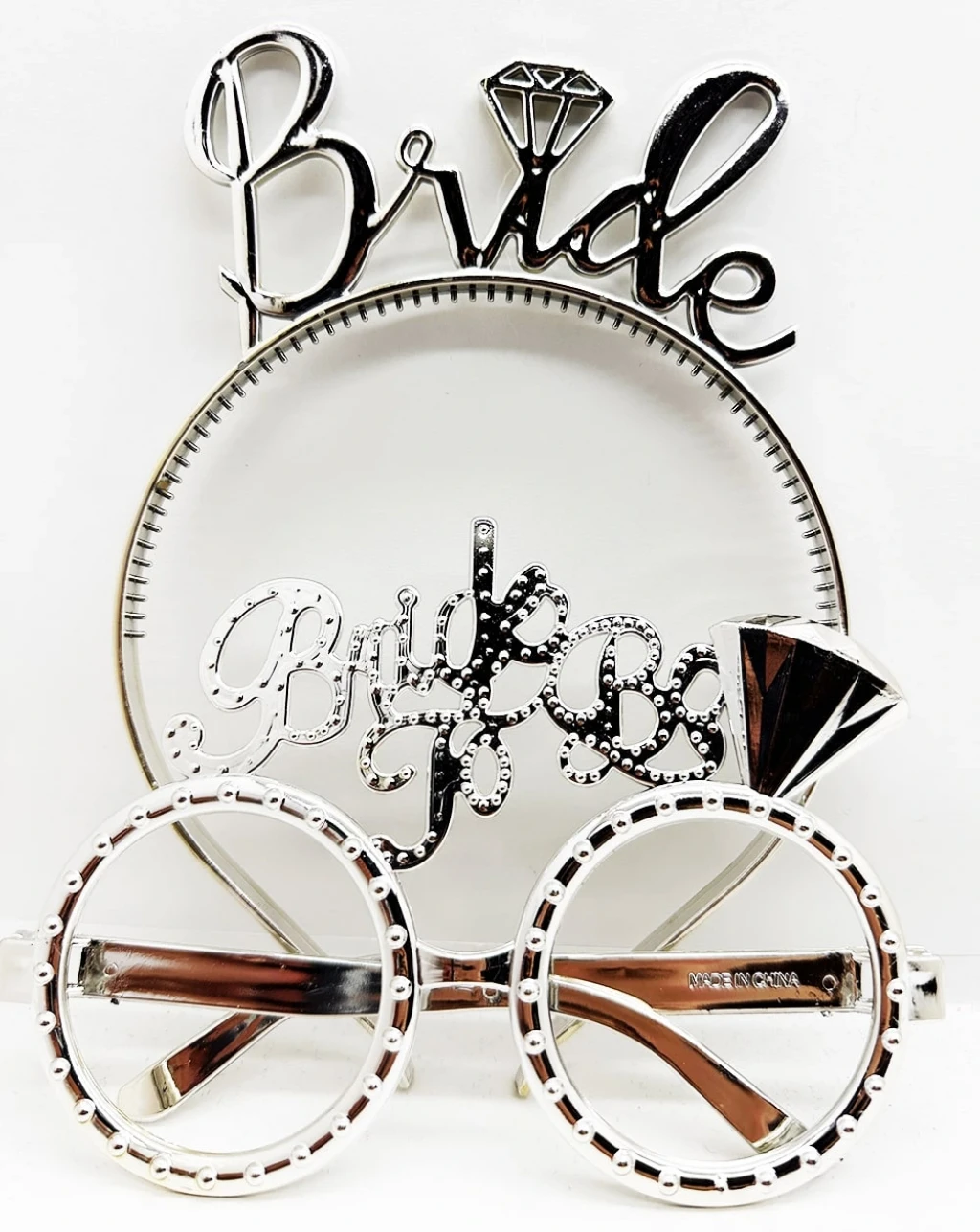 Bride Yazılı Taç ve Bride To Be Yazılı Gözlük Seti Gümüş Renk, bekarlığa veda partileri ve diğer özel günler için mükemmel bir aksesuardır. Taç ve gözlük plastikten yapılmış ve altın rengindedir. Taçta "Bride" yazmaktadır ve gözlüklerde de "Bride To Be " yazmaktadır.