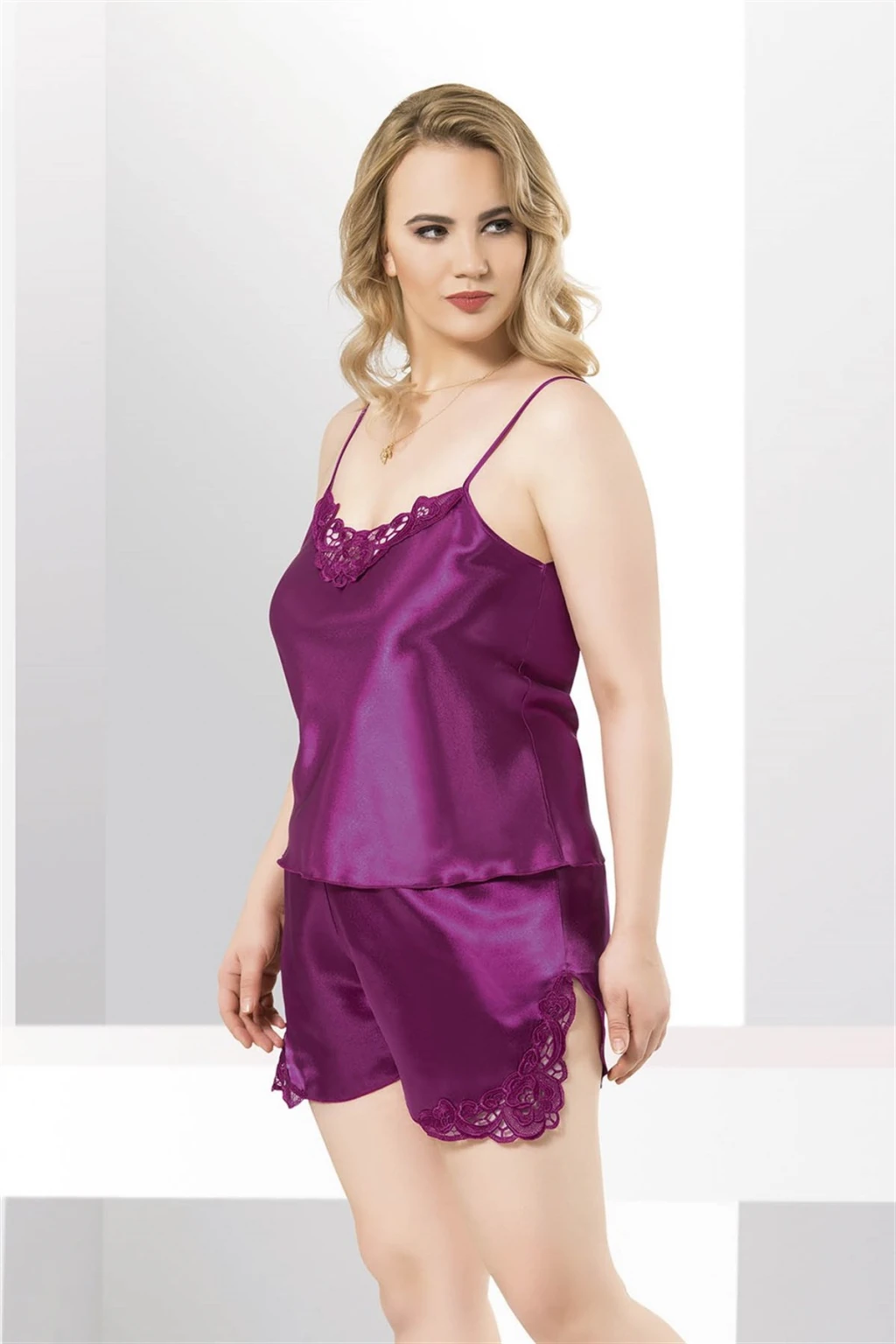 Büyük Beden Mor Saten Gecelik Babydoll Şort Takımı