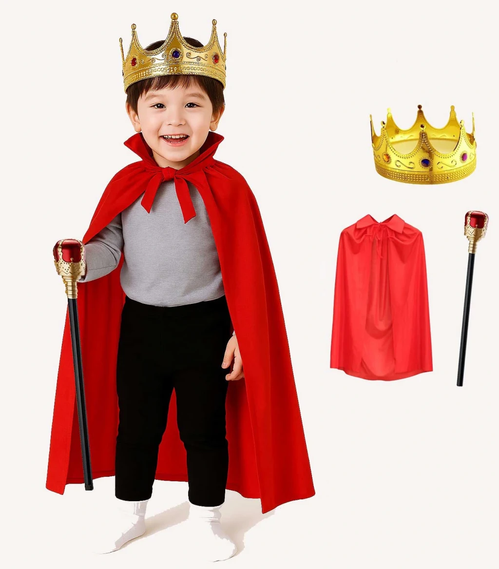 Çocuk Kral Kostüm Seti – Kırmızı Pelerin, Taç ve Asa (90 cm)