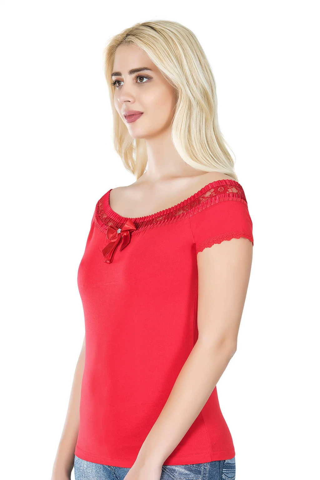 Yaka kısımlarından pileli ve fiyonk aksesuarlı, kolları dantelli yeni sezon kadın tişört modelidir.